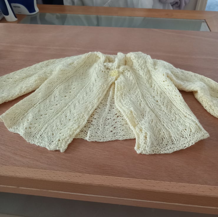 A beautiful lemon yellow cardigan in a pretty lacy design. This cardigan is to fit 0-6 months. .Chest size approximately 16 inches. Can be custom made to fit other sizes or in other colours. Please message me for details.
