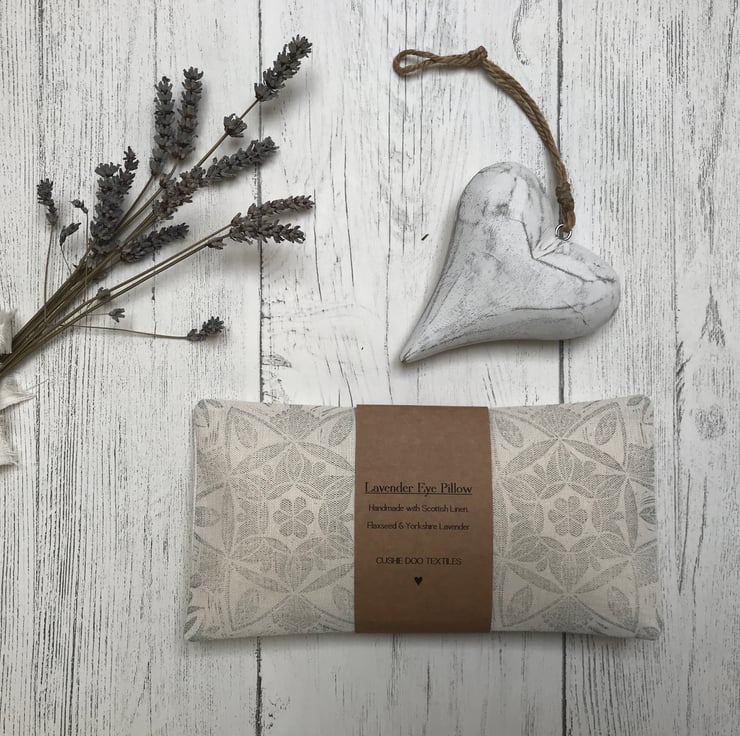 The interior pillow is made from natural calico and filled with Flax seeds for gentle acupressure and to block out light. The fragrance of the Yorkshire Lavender flowers can help to relieve tension and stress