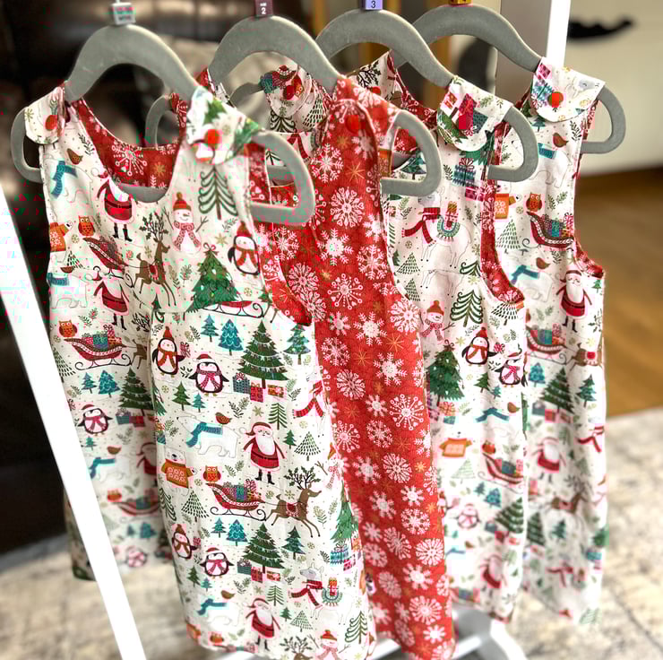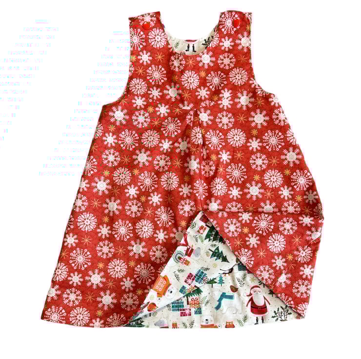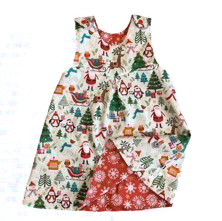 Festive Christmas reversible pinafore dress featuring Santa, Rudolph, Christmas Trees and much more on a cream background, with a red, white and gold snowflake themed fabric dress making this dress perfect for wearing before and after Christmas.