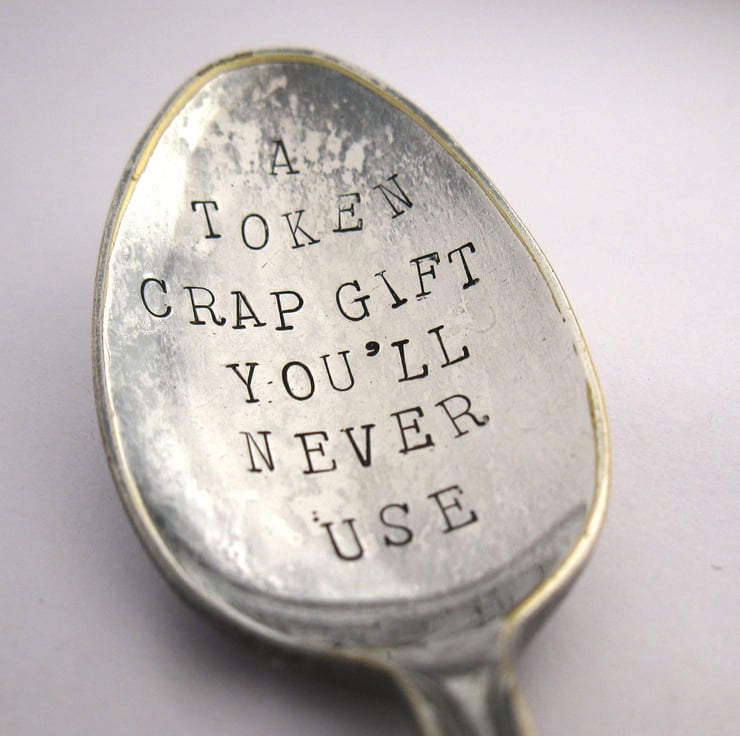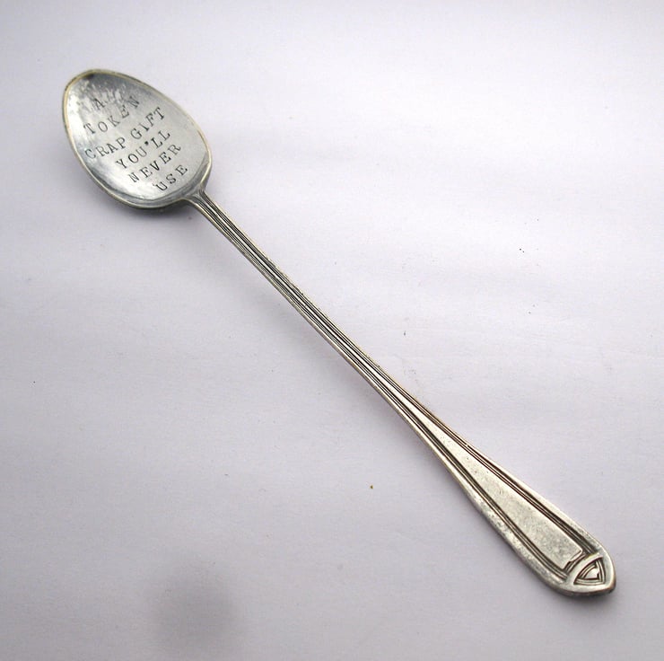 Pacify those awkward rellies this Christmas with this handstamped vintage silver plated spoon with the words A TOKEN CRAP GIFT YOU'LL NEVER USE hand stamped in the bowl. This gift delivers exactly what it says, hence managing expectations on both sides (and hopefully giving you a bit of a giggle into the bargain - and it IS a bargain at only a fiver). Could be good as a wedding, anniversary, birthday, retirement or pretty much any other sort of token gift too...