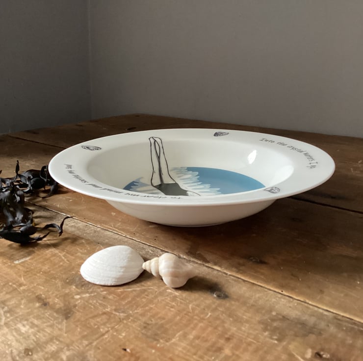 The designs on the bowl are taken from my linocut prints. They are hand applied by me, here in Cornwall, and then fired in the kiln.
