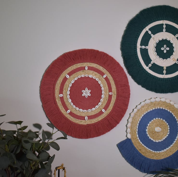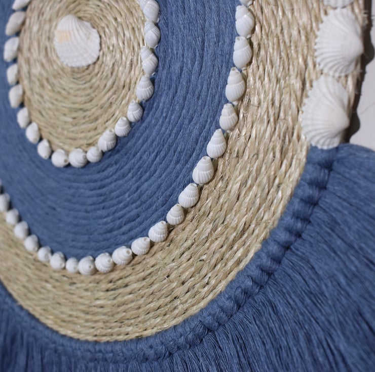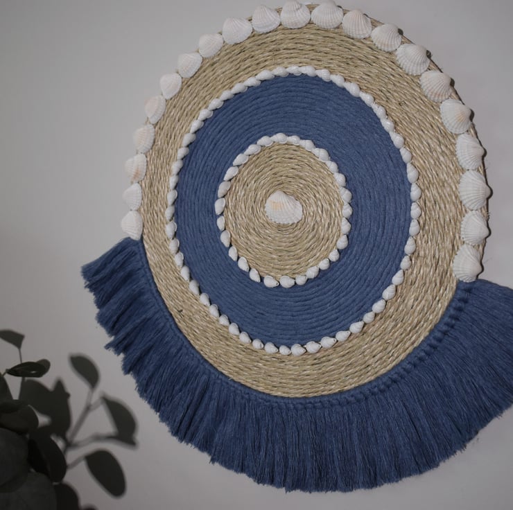 This wall hanging has been handcrafted using sisal rope and cotton macrame cord and decorated with 2 different types of shells. The diameter of the hanging measures 41cm at it's widest point x 36cm at it's longest point and comes with a pre-fixed picture hanger hook.