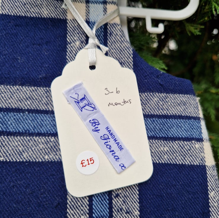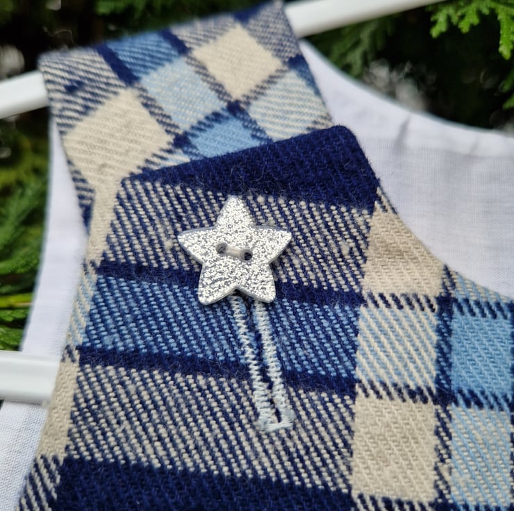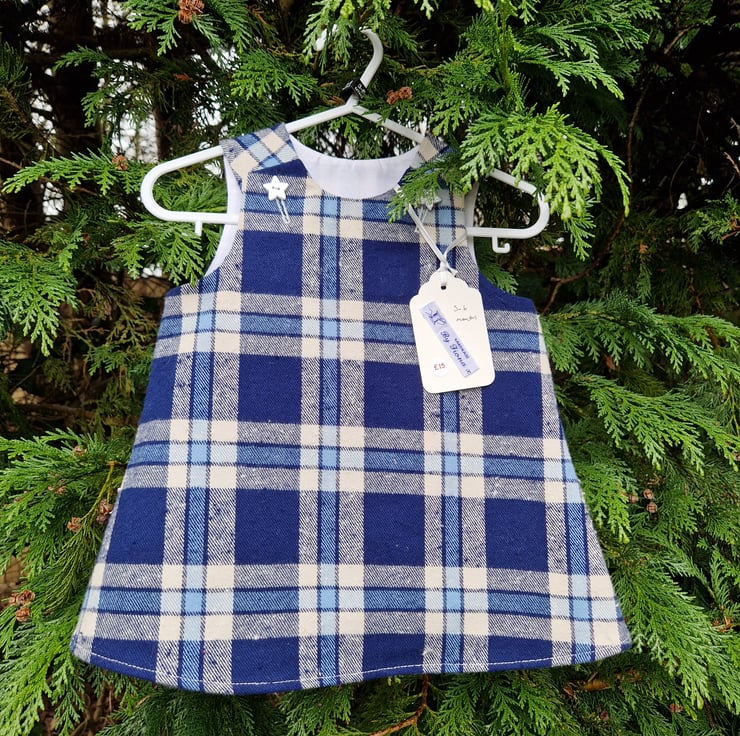 A fully lined A-line dress made from a medium weight multi blue check fabric and with plastic silver sparkly star shaped buttons. Can be worn with a long or short sleeve T shirt underneath and cardigan on top.