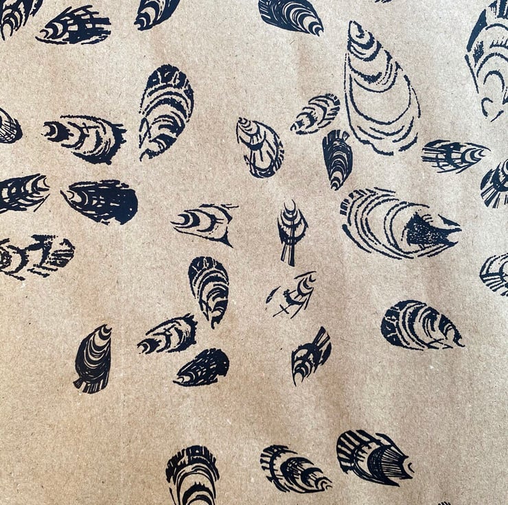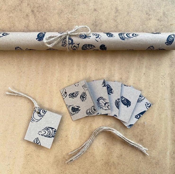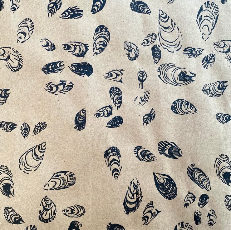 Hand Printed on 100% recycled Wrapping Paper with a quirky sea shell pattern. Gift Wrapping.