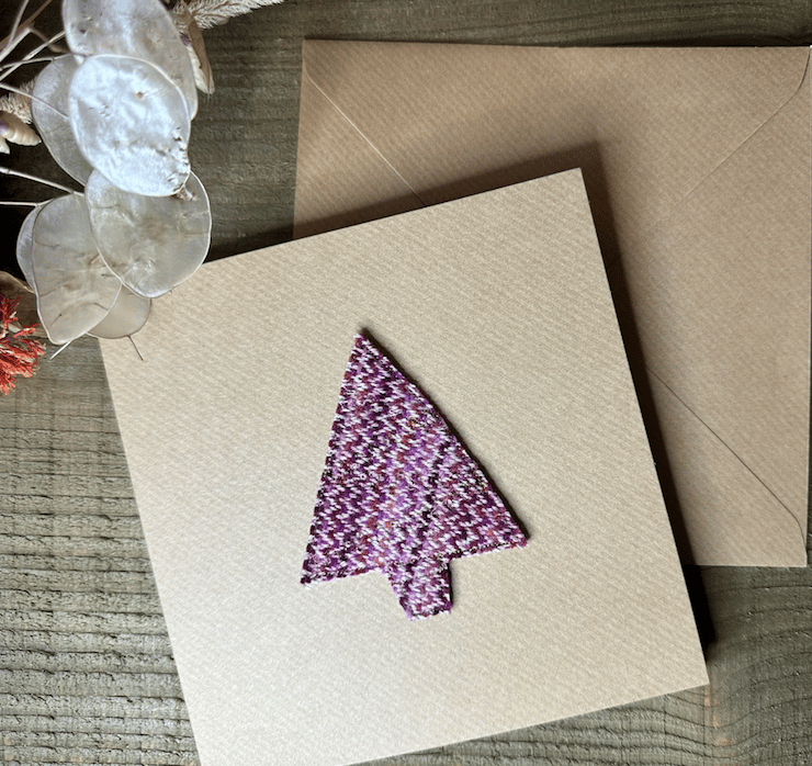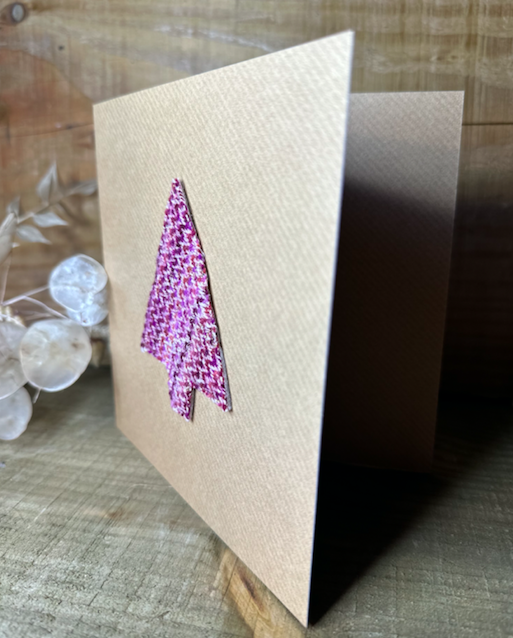 A one of a kind hand crafted Christmas Card featuring a Hand painted & Hand woven British wool pinky Christmas tree, layered with a natural wool felt to give some extra depth.