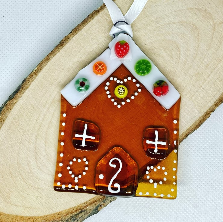 An amber glass gingerbread house with hand painted decoration and gorgeous little glass fruit murrini.