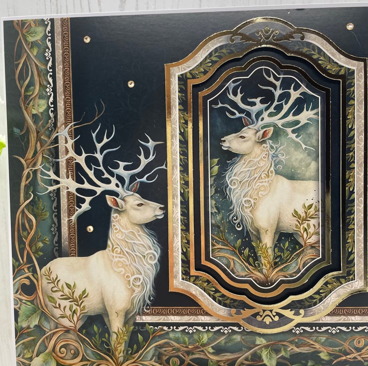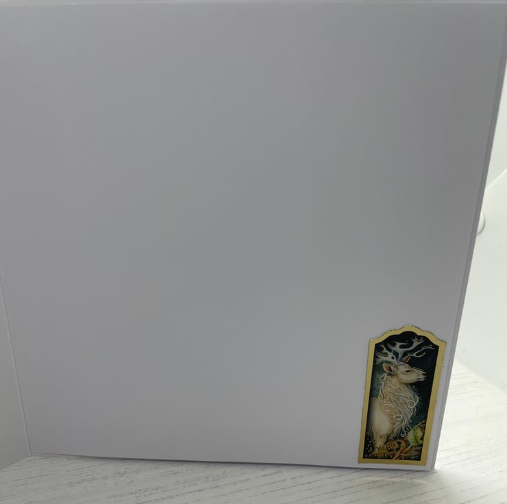 White 7” x 7” card and envelope with a decorated backing card, with a framed white stag. The inside has been left blank for your own message