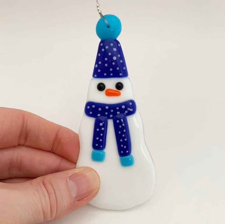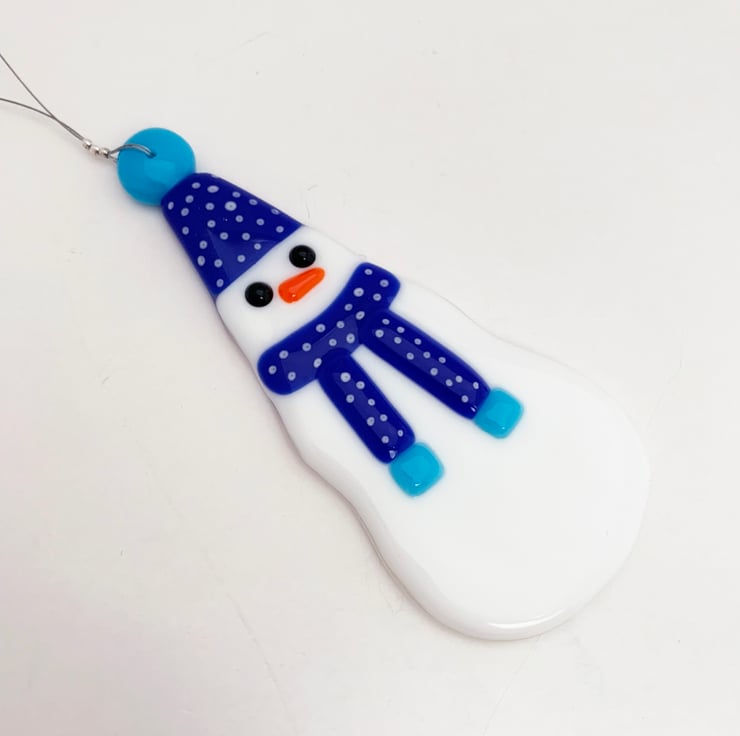 Fused glass hanging snowman decoration, with a blue spotty scarf and bobble hat. This looks lovely on a Christmas tree and would make a great postable gift.
