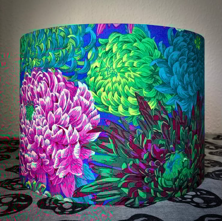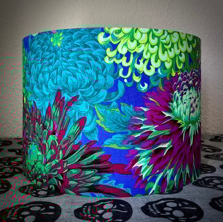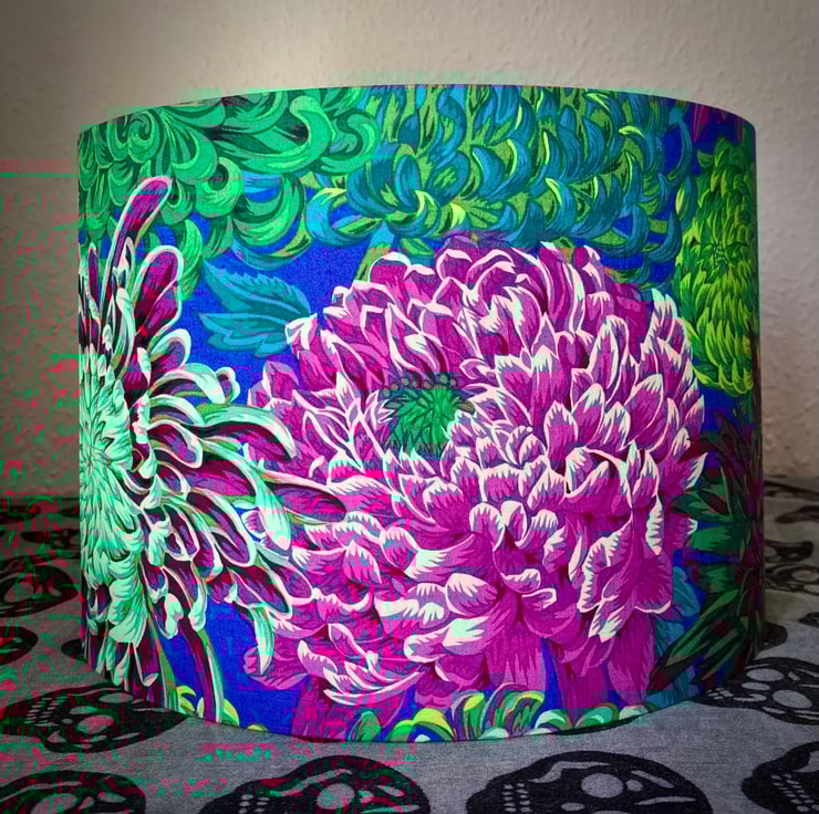 This stunning Kaffe Fassett design shade features beautiful Japanese chrysanthemums in greens, purples, and blues on a bright blue background.