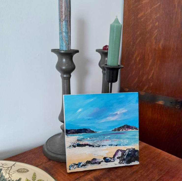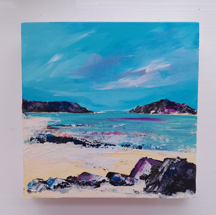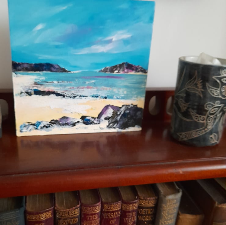 This 6 x 6 INCH painting is varnished signed on the back and has a hook ready to hang. Great to brighten up a small corner or to give as a gift. signed on the back.