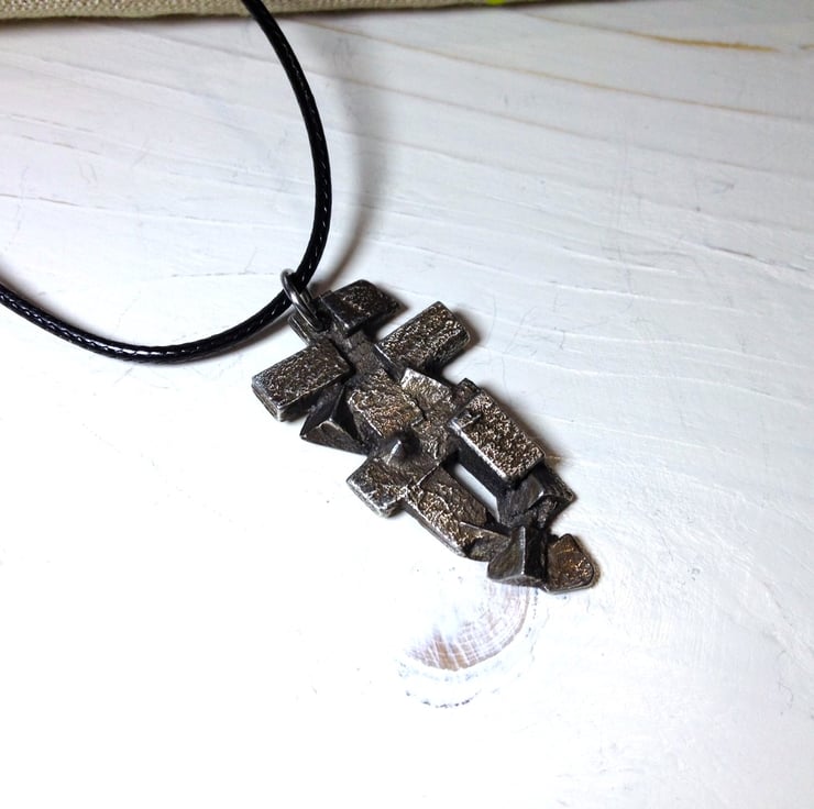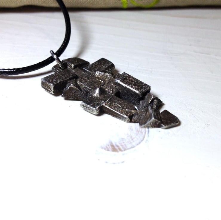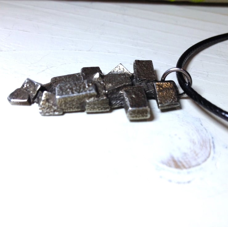 Sculptural pewter pendant. Cast in my studio it has quite a bold design on the front and is flat on the back but also textured. It's then patinated to show up the design and hung on an 18" cord with a lobster clasp. Pendant measures approx. 40mm long.