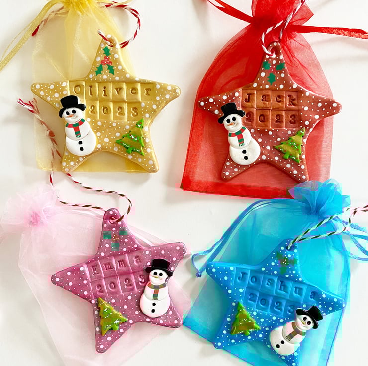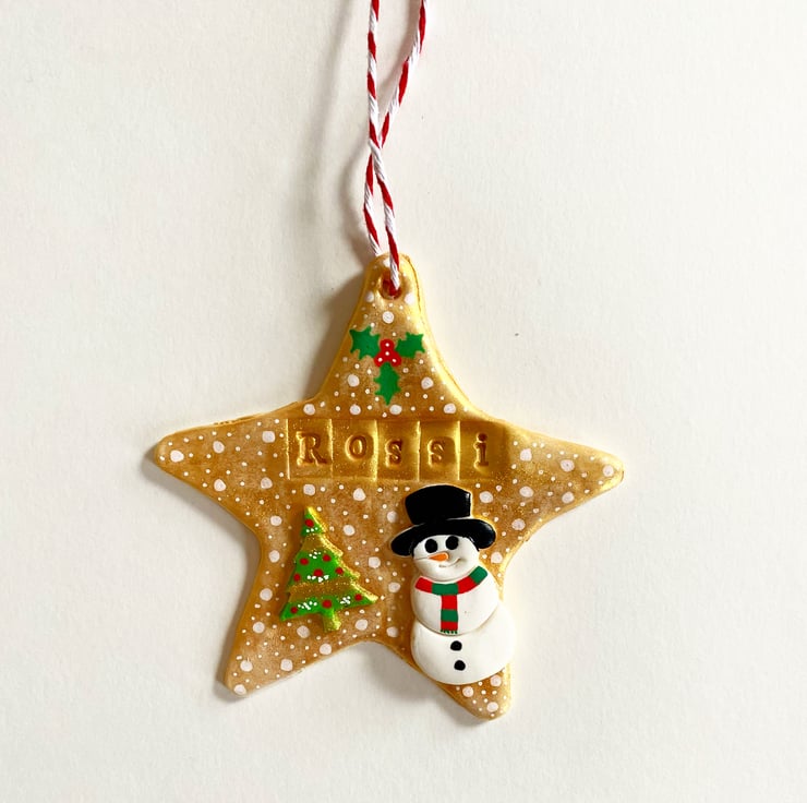 Personalised Christmas star hanging decoration, handmade from polymer clay. Name can be a maximum of 6 letters due to the size of the decoration. please message to say which name you would like put onto your star and whether you’d like a gold finish or a different colour I will be able to do most colours, however please note the back of the star will be white. Free postage on all items. Please allow up to a week for me to make and ship your personalised item though it will likely be sooner than this.