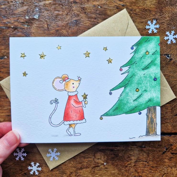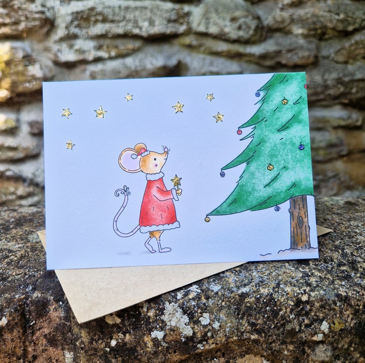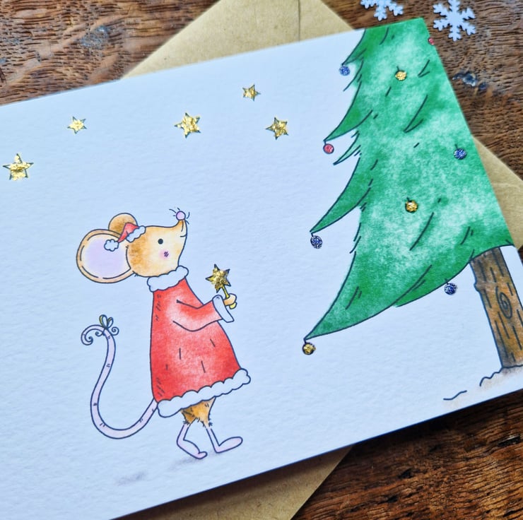 An adorable mouse Christmas card, decorating the Christmas tree, the perfect way to send some Christmas cheer to family and friends. This Christmas card is handprinted on textured card and hand glittered with plant based glitter! (P.S: If you would like to purchase multiple cards, there are Christmas card 'choose your own bundle deals' available in my shop for this month!)