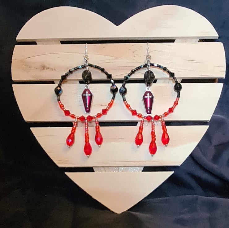 A large pair of dangly earrings with Black and Red glass beads and Skull charm beads. The red beads at the bottom are like blood drips.