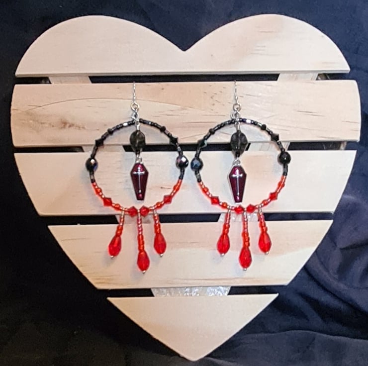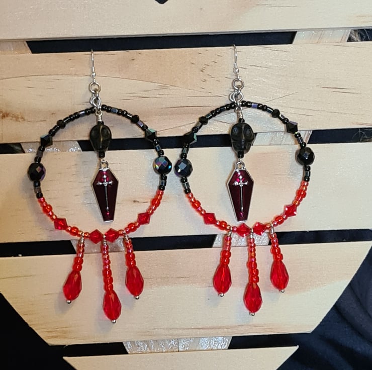 Earring length is approx 12cm long from top of the ear wire to the bottom of the beads. Ear wires are Sterling Silver. Hoop parts are approx 6cm wide. Beads are glass, some of the black/Red ones are shimmery, skull beads are dyed Howlite.