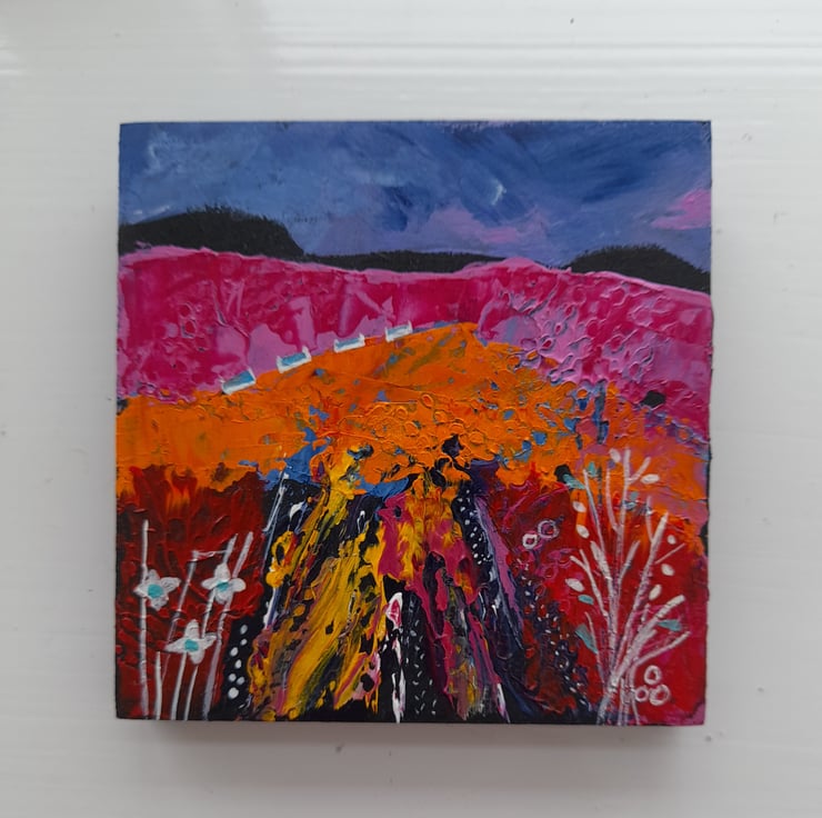 This 10 x 10 cm painting is varnished signed on the back and has a hook ready to hang. Great to brighten up a small corner or to give as a gift.
