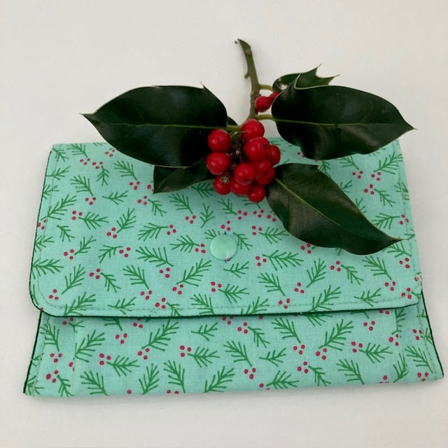 This is a rigid fabric pouch with a printed fabric of green foliage and berry on a pale green background.