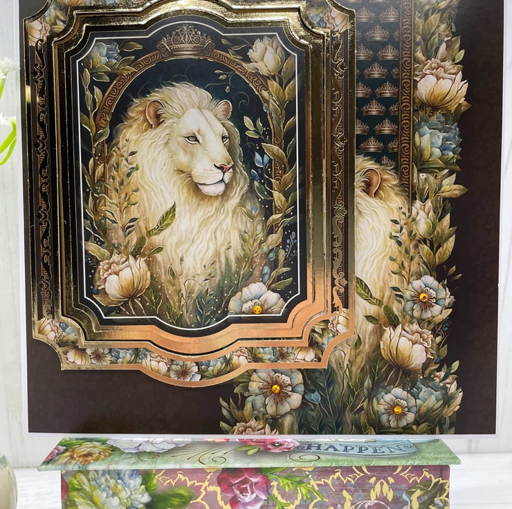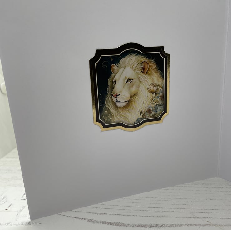 White 7” x 7” card and envelope with a decorated backing card, with a framed white lion. The inside has been left blank for your own message