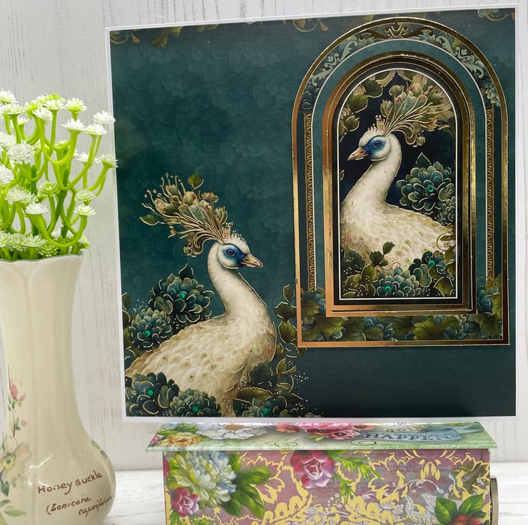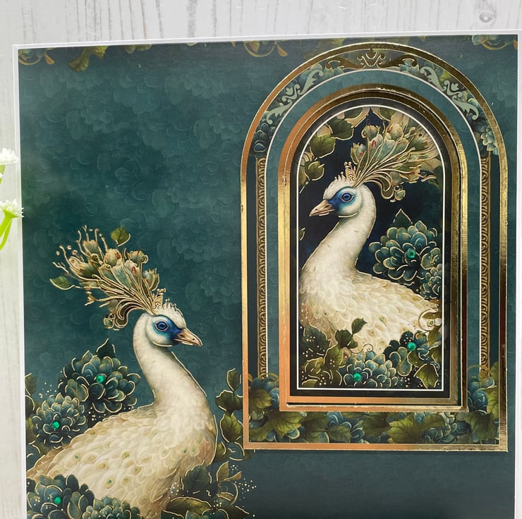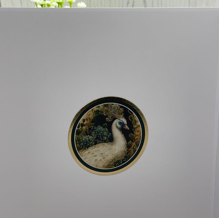 White 7” x 7” card and envelope with a decorated backing card, with a framed white peacock. The inside has been left blank for your own message