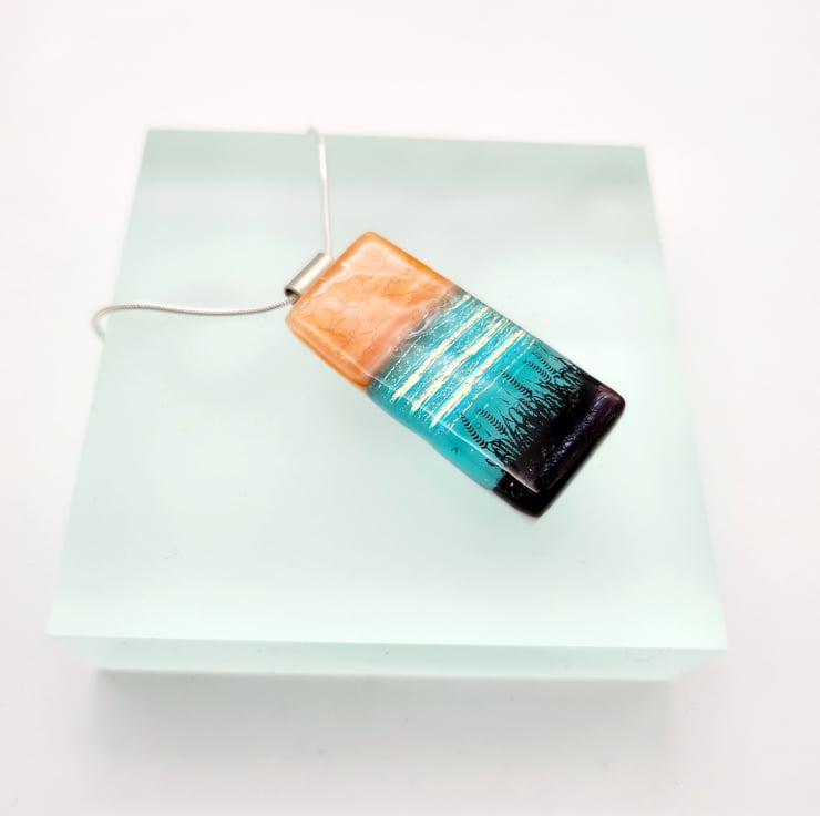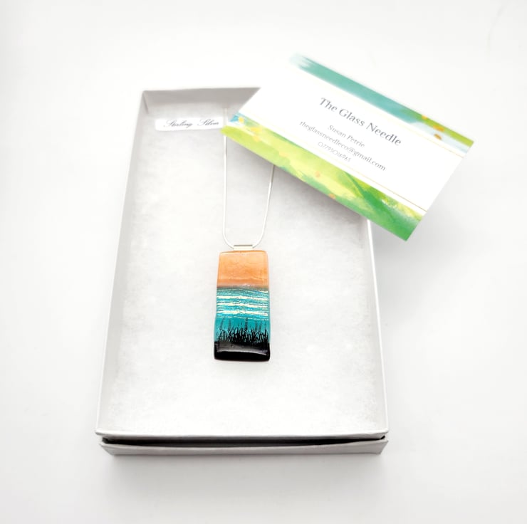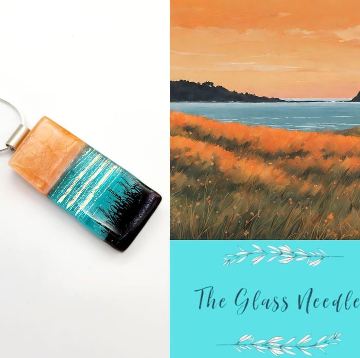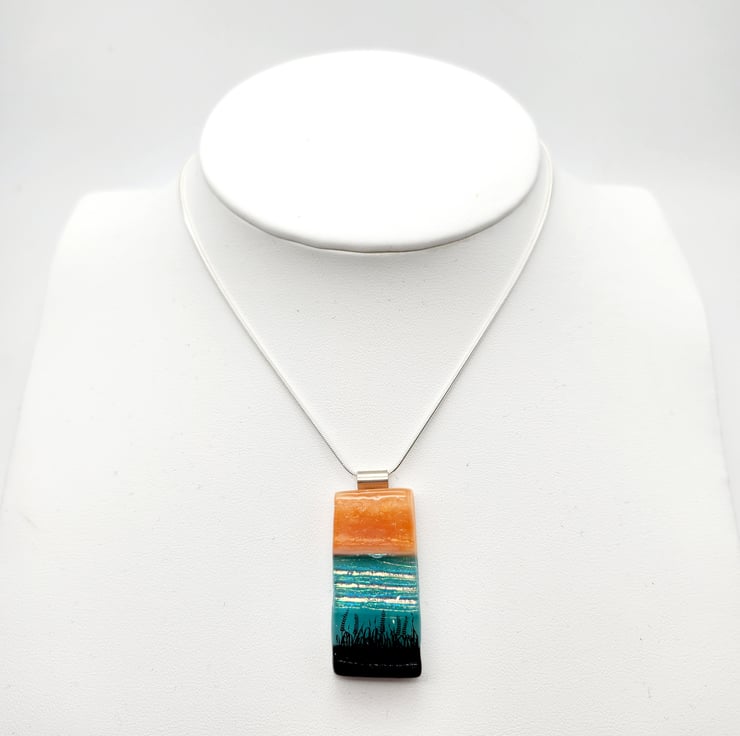 A stunning fused glass pendant featuring a beautiful landscape. The sky is a vibrant shade of orange which contrasts with the tranquil turquoise water. The shadow of a meadow in the foreground adds to the depth of the pendant.