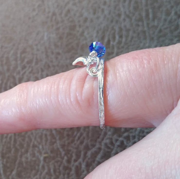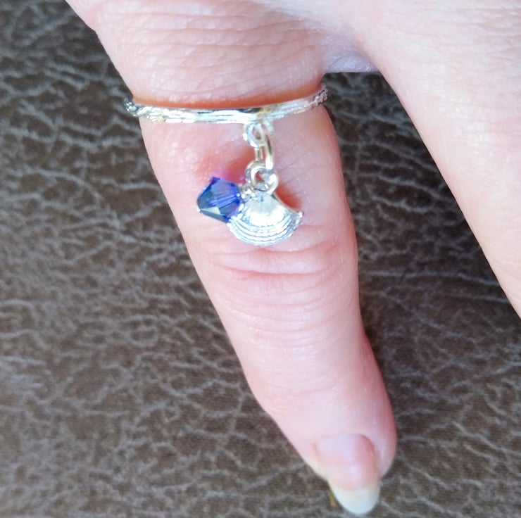 A delicate 925 sterling silver textured band ring with a sterling silver shell charm and a sea blue swarovski crystal bead gently swaying from it.