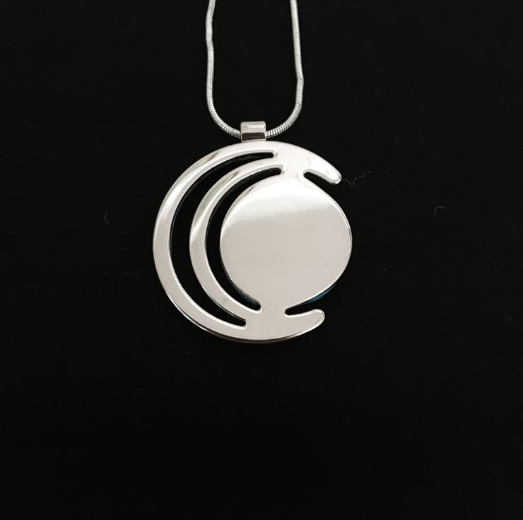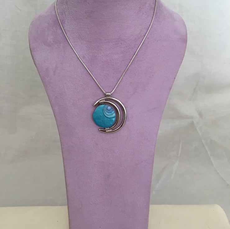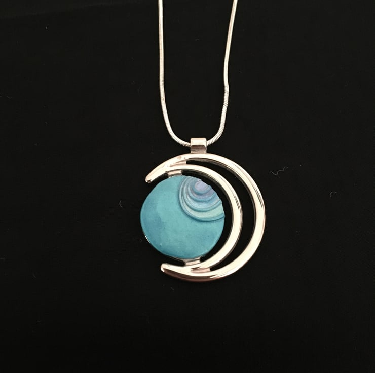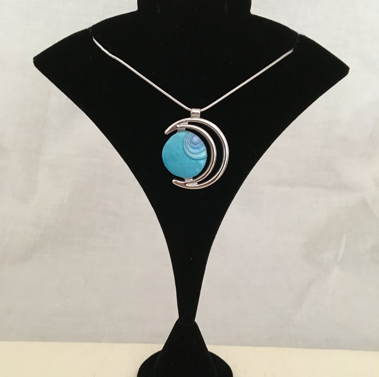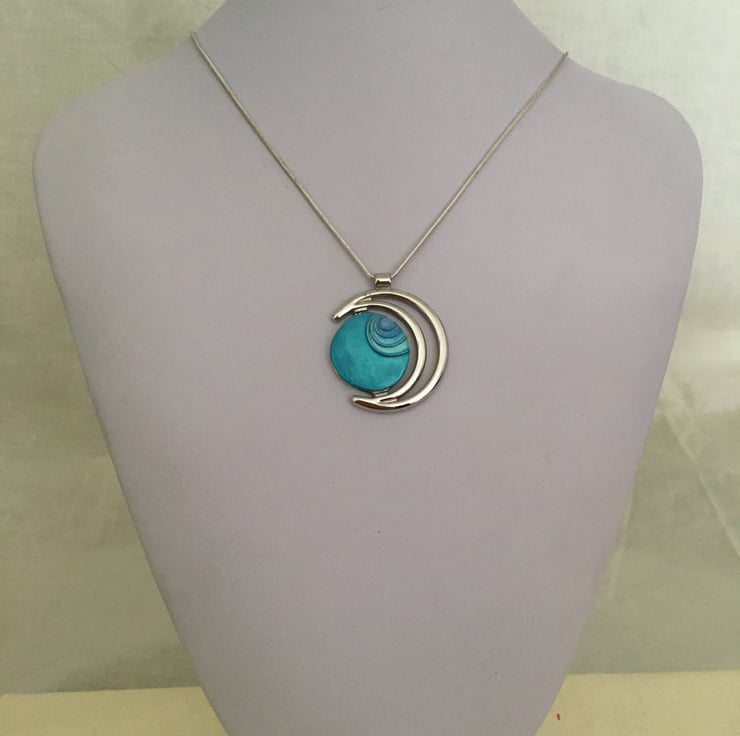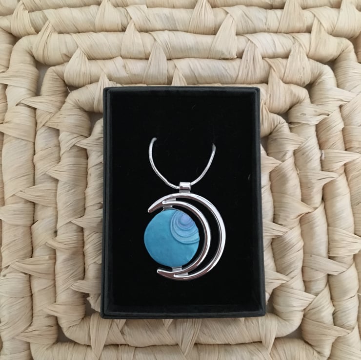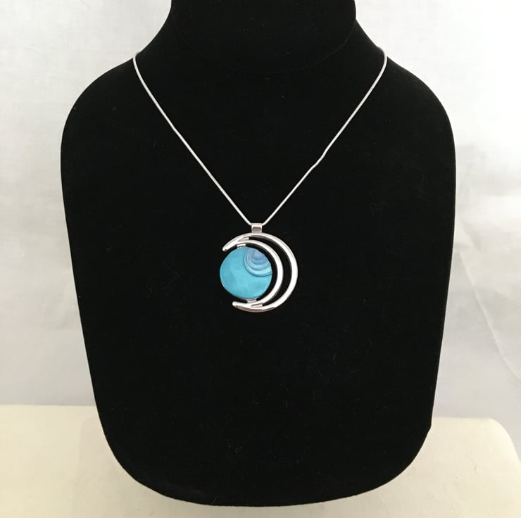 Stunning handcrafted azure moon pendant in a high quality silver plated setting.