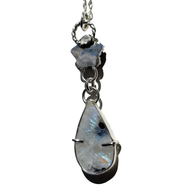 Wrapped in .999 Fine Silver around the outside of the moonstone, solid silver back on star and twisted silver loop