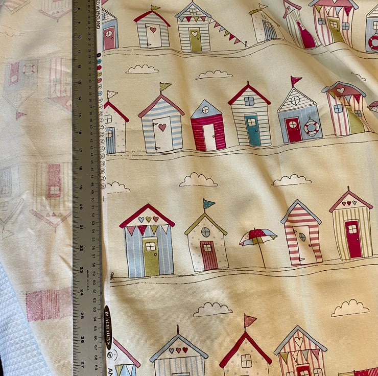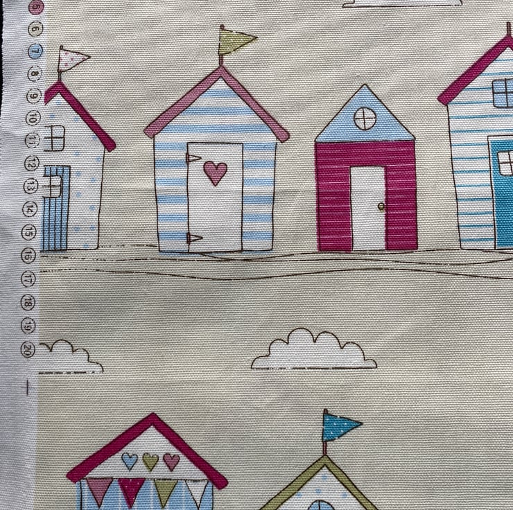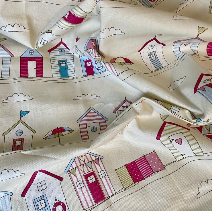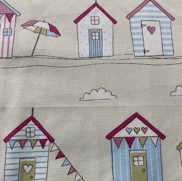 This beautiful heavyweight cotton fabric has an off white background and beach huts and bunting in pinks and cream tones.
