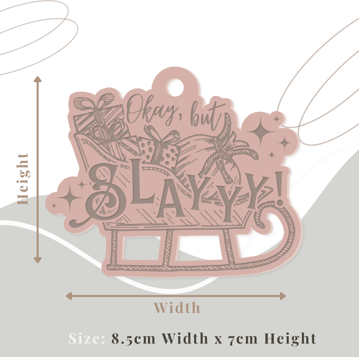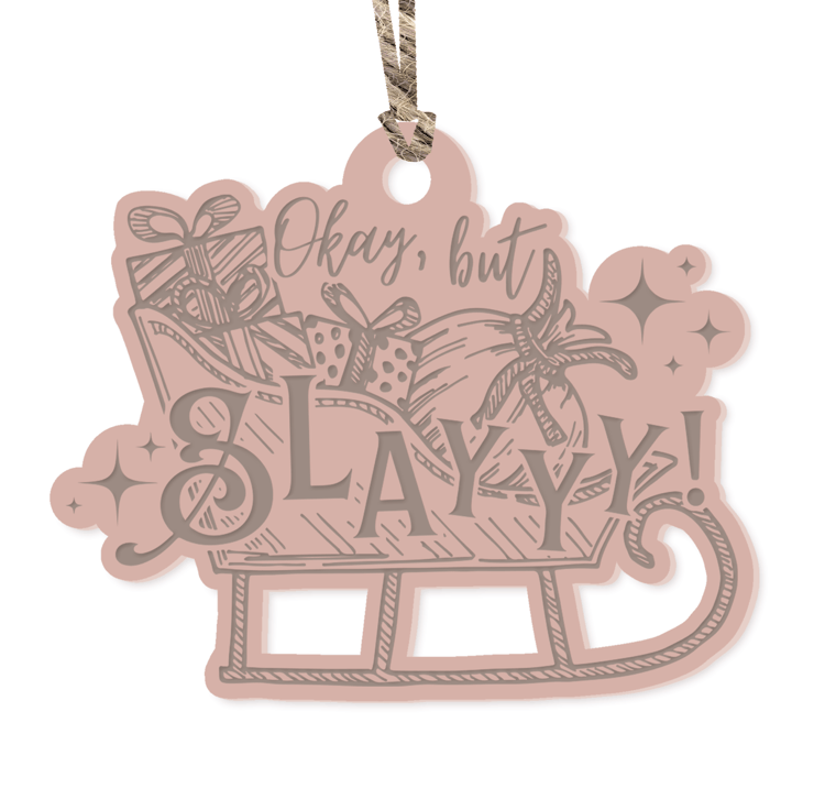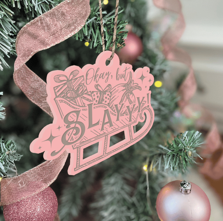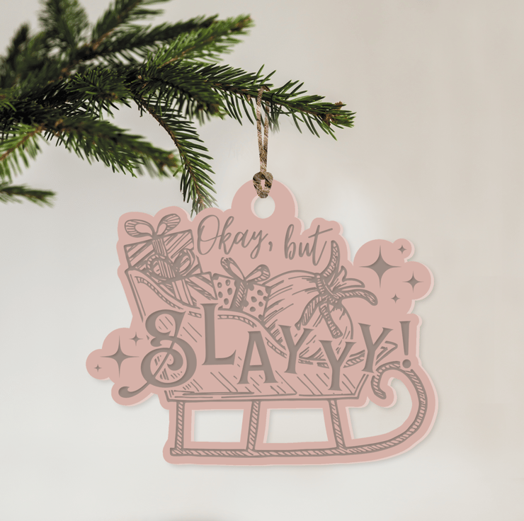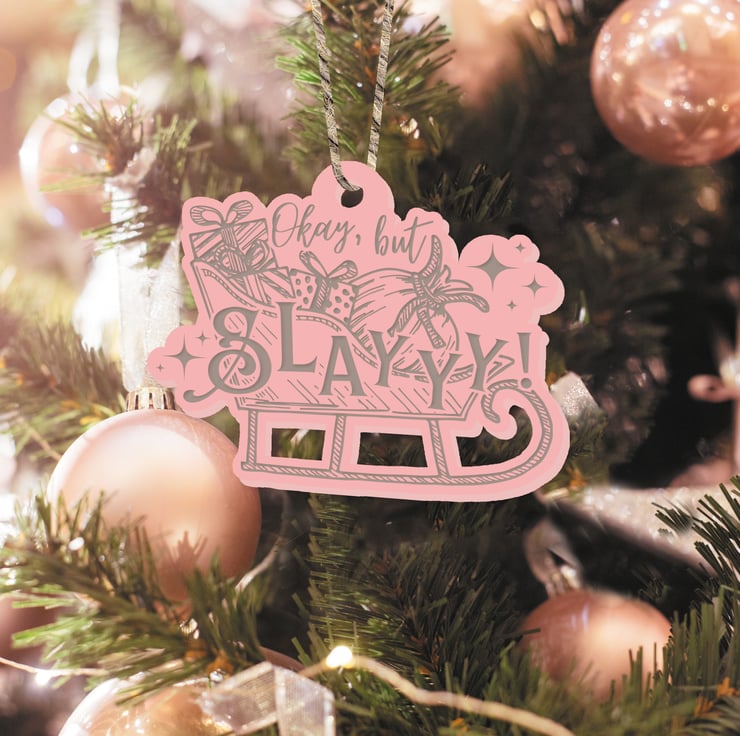 Yas Queen!!! Add a touch of festive magic to your Christmas tree with a light pink acrylic sleigh pun ornament. It's durable, lightweight, and perfect for adding some fun to this year's celebrations. Hang it with ease and watch it sparkle under the lights. The ornament is a great gift for those who love puns or pink, and a subtle way to show off your sense of humour. Get yours today and spread some holiday cheer!
