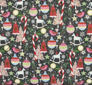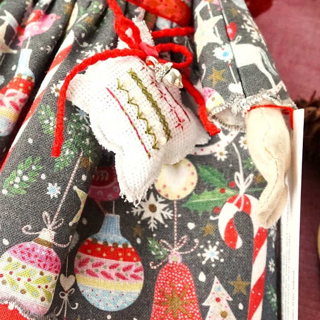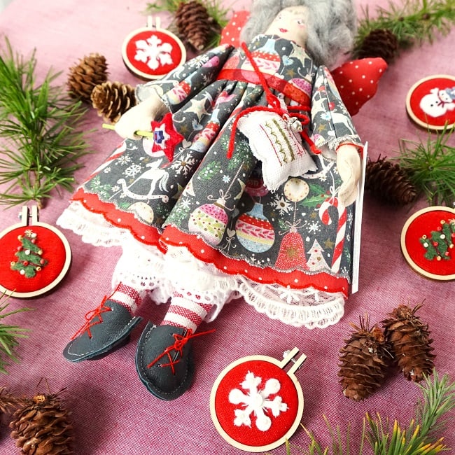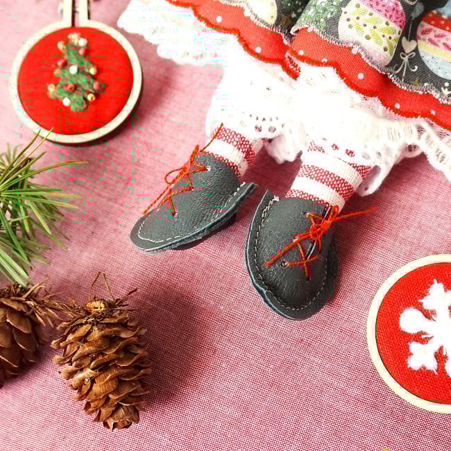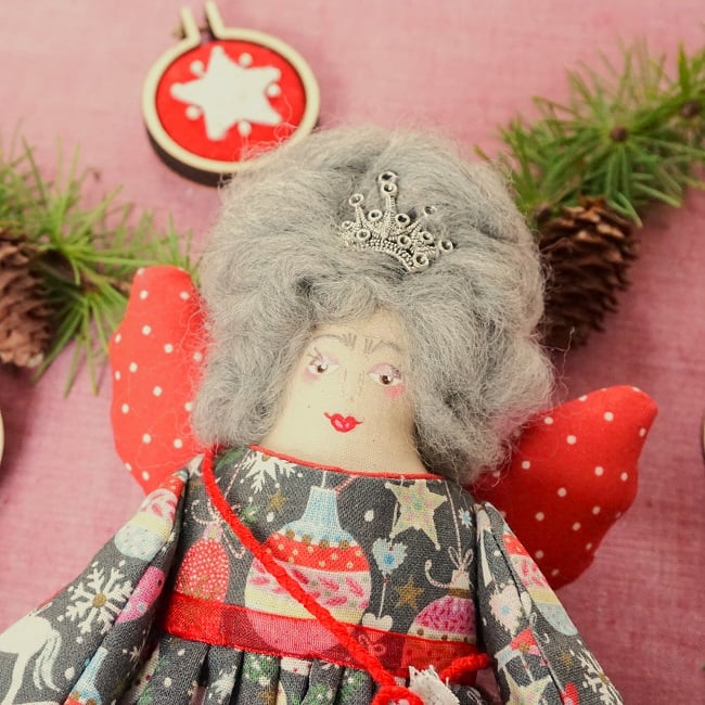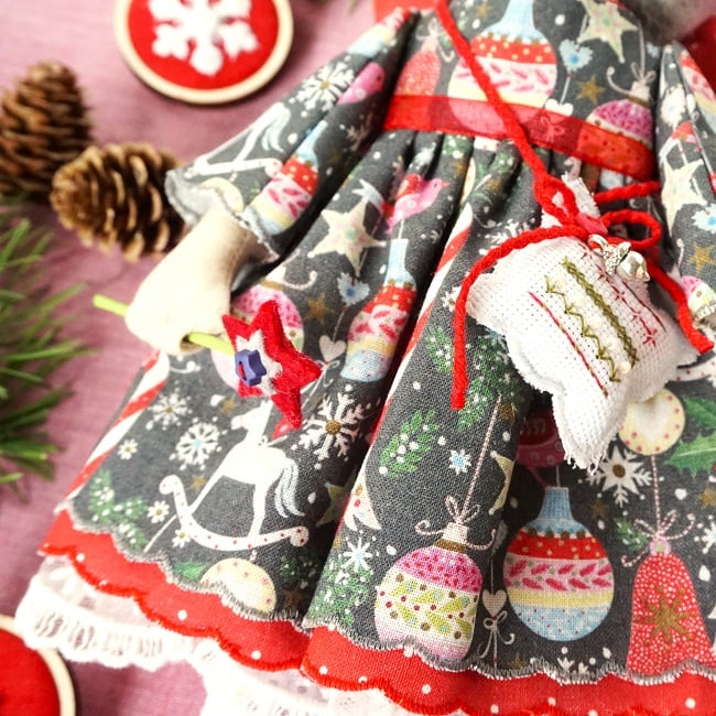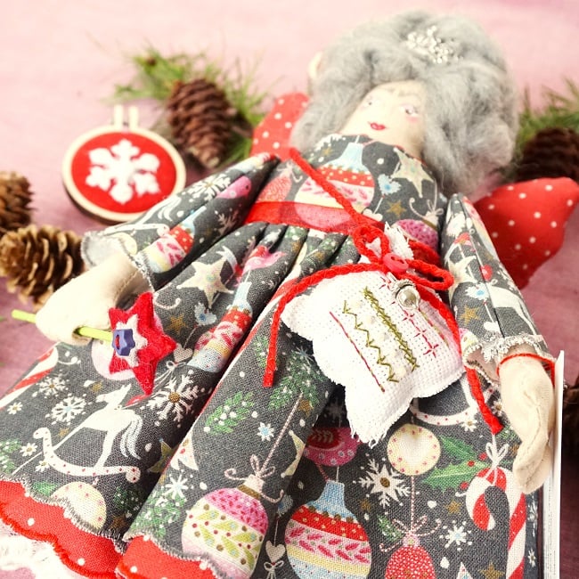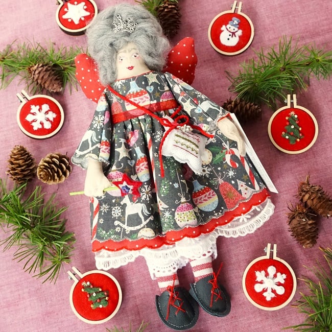 This is Ilsa. A smaller pattern, she is about two thirds the size of my witch. This little Fairy God Mother has an Acufactum print dress with a grey ground, covered with tiny baubles, rocking horses and candy canes. It is called Vintage Bauble. She has wings that match her underskirt and sports a little felt wand. Her shoes are the smallest I have ever made and are leather. She has garnet to her heart with rosemary in her stuffing and is finished with tiny buttons, organza ribbon and a little coronet in her hair.