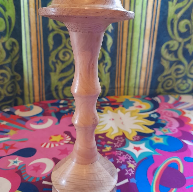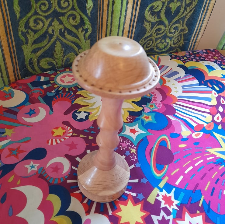 This earing holder will store up to 15 pairs of earrings so you never have to hunt around in the bottom of your jewellery box for that lost earring again. Hand turned using oak for the base and top, finished with an apple wood stem. Will look good on any dressing table. 20cm high.