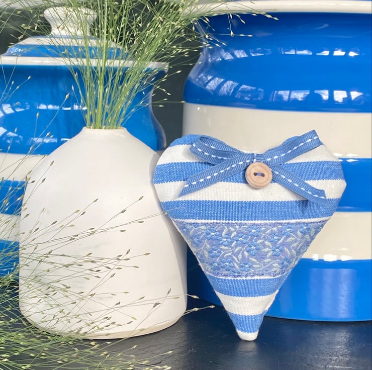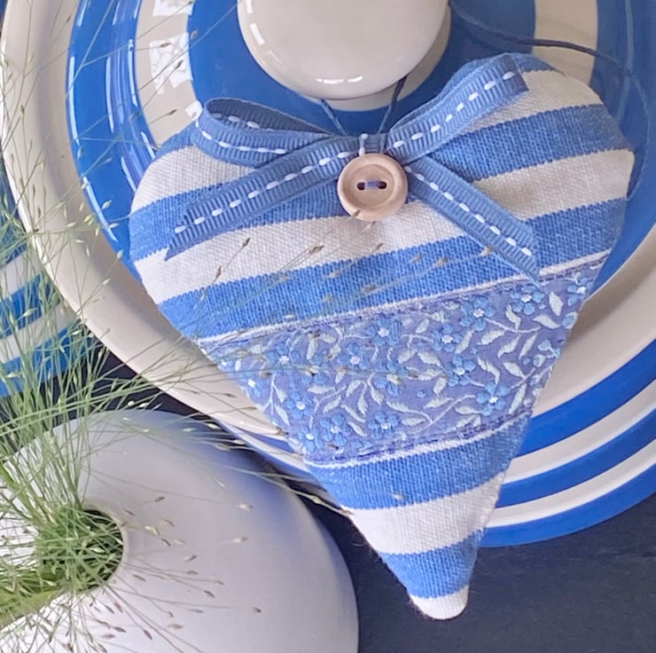 Generously filled with gloriously fragrant and locally grown Hampshire lavender and finished with a round wooden button, blue hemp twine hanging ties, a (removable) blue stitched ribbon bow, and a printed 'heatherandhome' linen label on the reverse side.