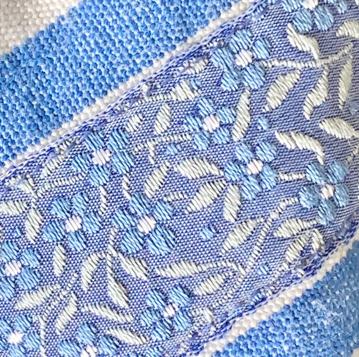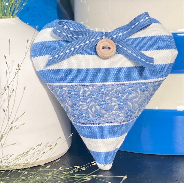 November's Heart of the Month is this classic blue and white striped heart, complemented with a truly exquisite woven ribbon, featuring a lovely frieze of delicate Forget-Me-Not flowers.