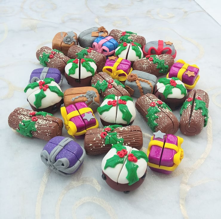 Each set of 4 includes 1 Christmas Pudding, 1 Yule Log and 2 Christmas Presents and 5 blank name cards for you to write on. Each piece will be randomly chosen by myself individually wrapped and placed in a storage box. With TLC will last for many Christmases to come.