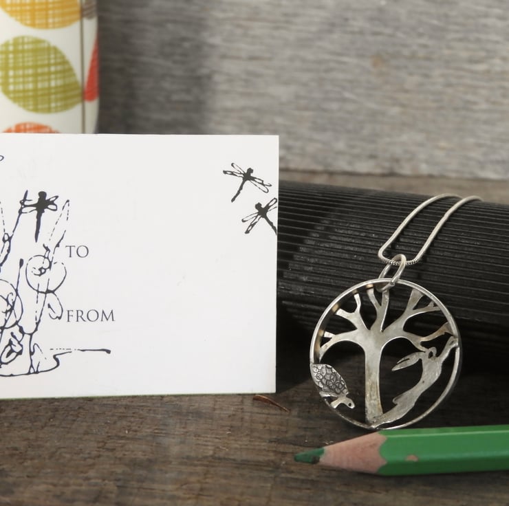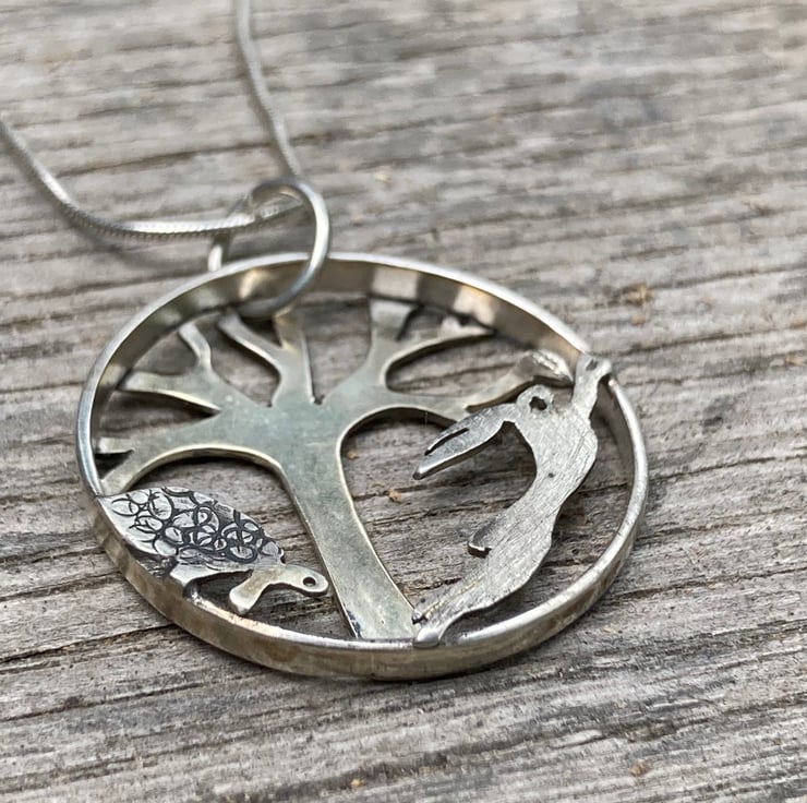 Each piece of this pendant has been intricately pierced by hand from eco silver, and the tortoise’s shell and hare have been individually textured to bring the characters to life. It hangs on a delicate sterling silver rope chain.