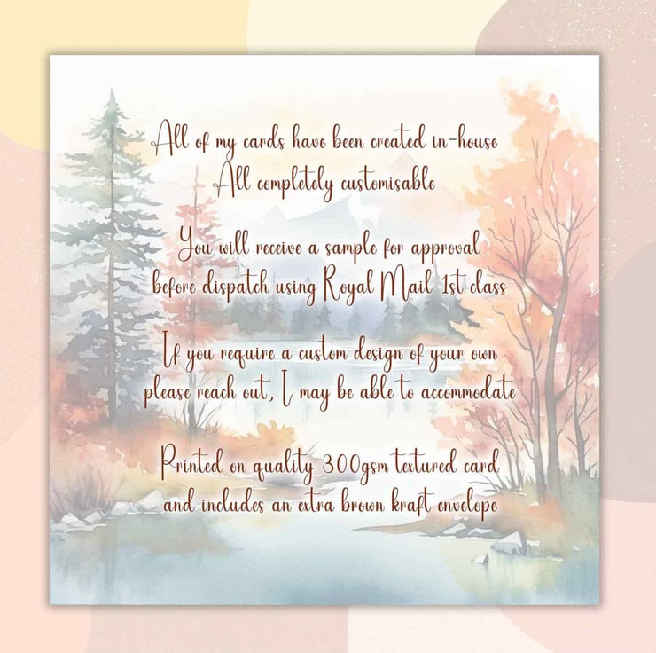 Customised message greeting cards including Happy Birthday, Happy Anniversary, Congratulations, Love You, Pet loss and many more cards personalised with your own details. Designed In-house, Watercolour style, Personalised greeting cards with unique designs not sold elsewhere.