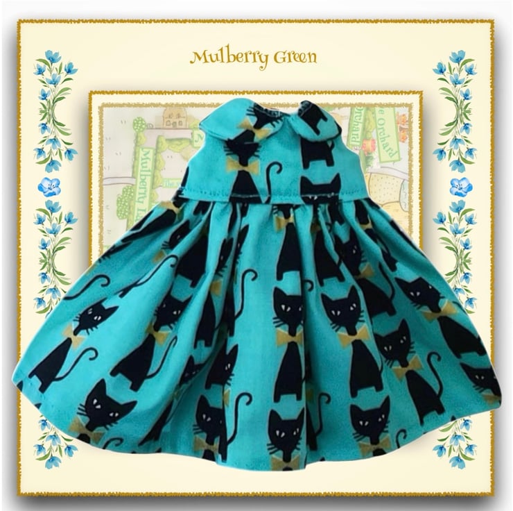 A gorgeous little dress in a turquoise and black cat print, to fit the Mulberry Green characters. The dress is made from best quality cotton and has a Peter Pan collar and a lined bodice.