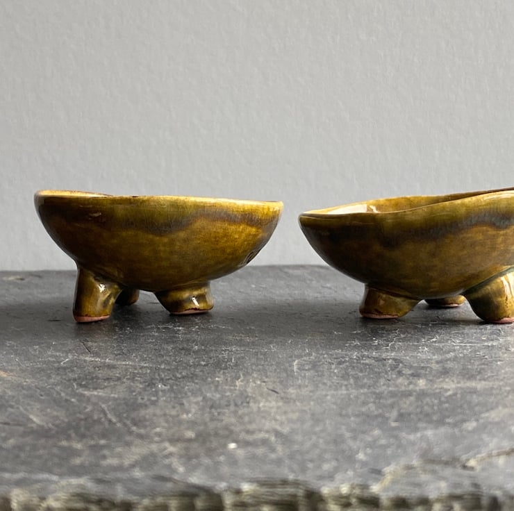 Each bowl features three charming stubby feet and is beautifully glazed in a rich, earthy Cider yellow thats slightly mottled