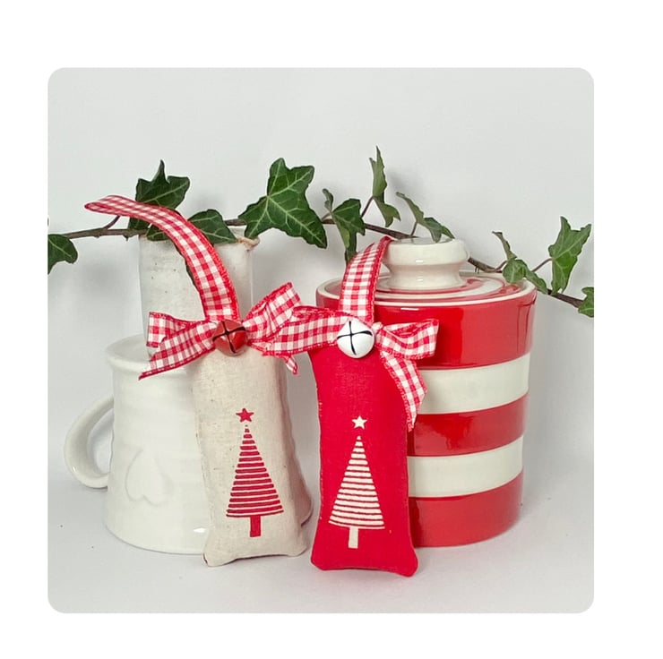 A simple and understated Scandi-inspired Christmas decoration, featuring a festive red Christmas tree silhouette topped with a star, on a cream background. The reverse side is in a cheerful red and white checked fabric with a linen h&h label.