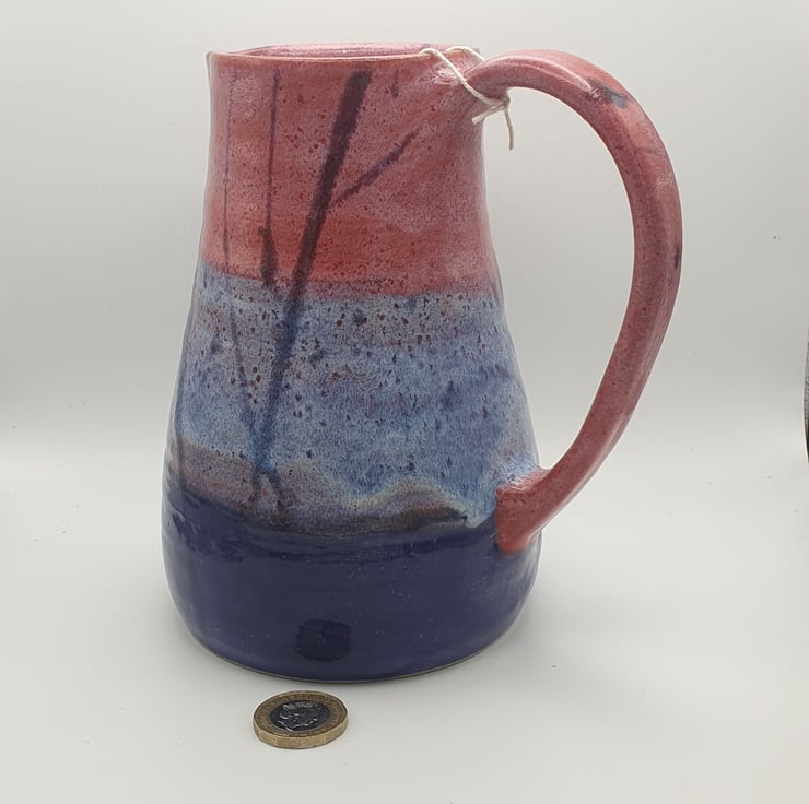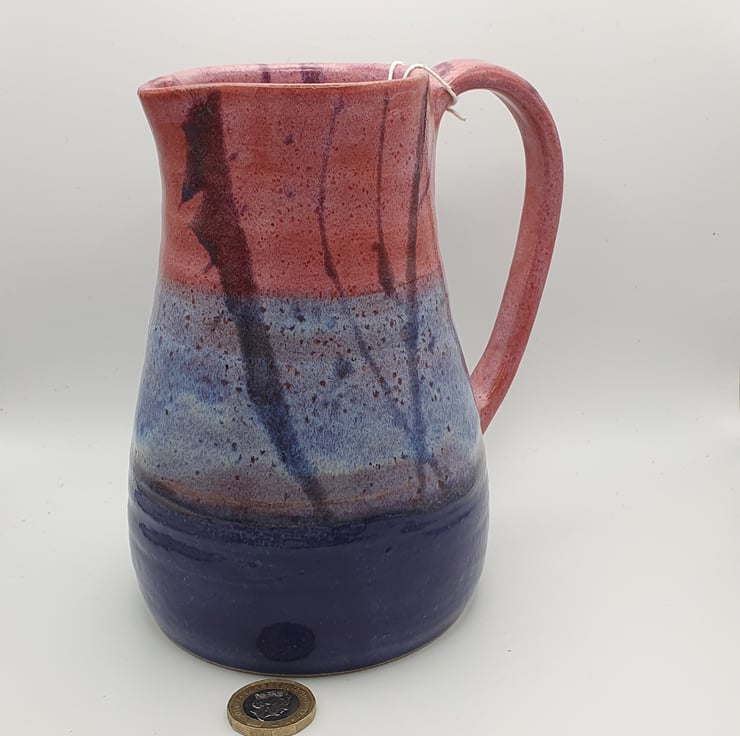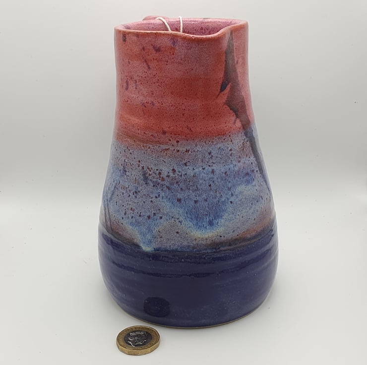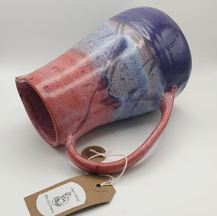 Wheel thrown. Stoneware clay. Glazed in raspberry, lavender and purple gloss. Flecks of purple gloss were added before firing.