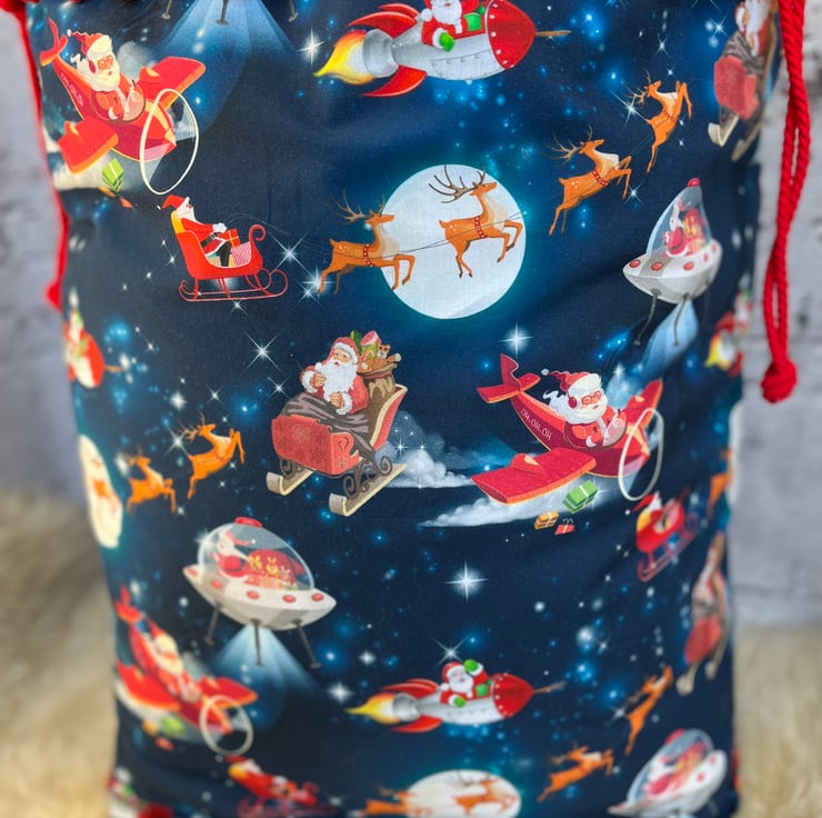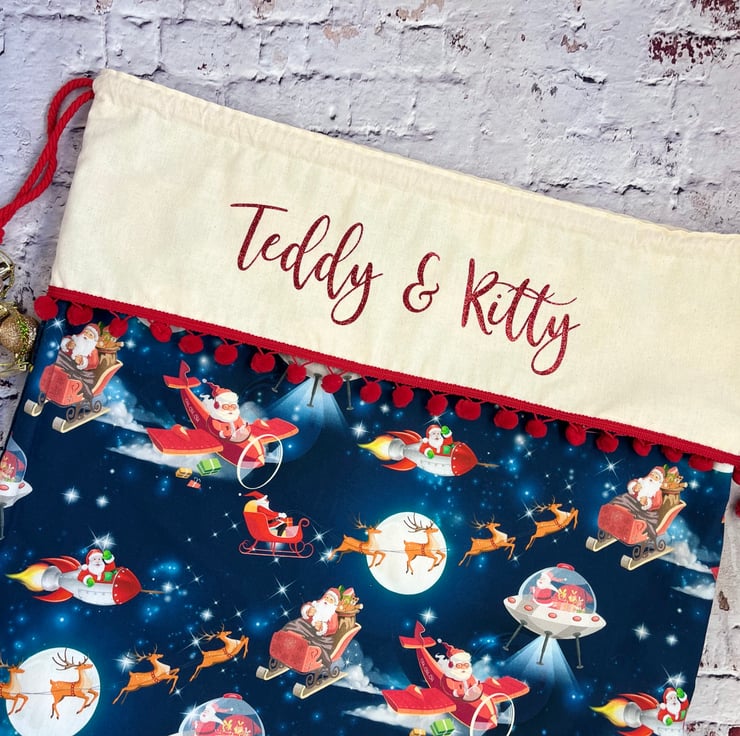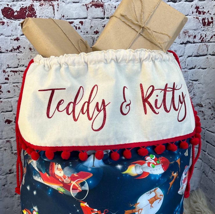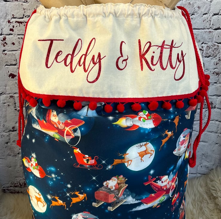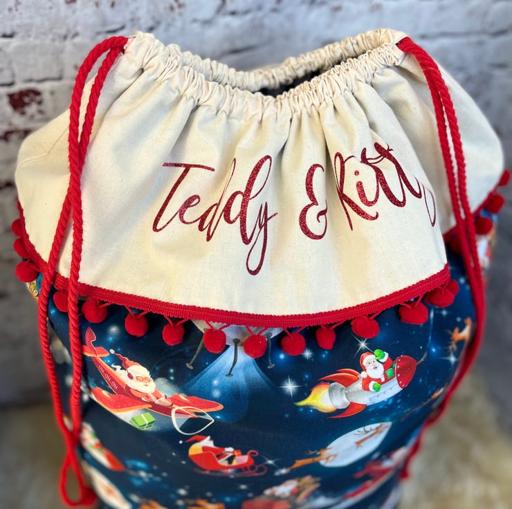 This fabric design is so fun and unusual. It's a big hit with a vehicle lover! It contains some very cool Santas delivering presents in all his best rides; sleighs, a spitfire aeroplane, a rocket and a space ship. The natural calico lining is rigid enough to ensure this Santa sack keeps its shape and is strong enough to hold all the goodies Santa is kind enough to leave inside. Personalised with top quality heat transfer vinyl in the sparkliest of red glitter finishes which pairs with this fabric fantastically. I designed and made the pattern for this sack myself to be what I believe is the perfect size, neither too big or too small. The cuff and lining have a beautiful rustic look and feel and the red pom pom trim is made from the highest quality pom poms, specially sourced for their quality from my local independent fabric shop. The red drawstring adds a lovely touch and can be used to hang your sack or tightened to secure the presents inside. The materials used in this design make the perfect combination that will make a highly unique and thoughtful gift for your chosen recipient or if Santa is looking for an upgrade!