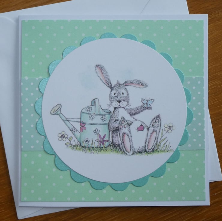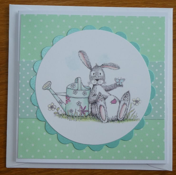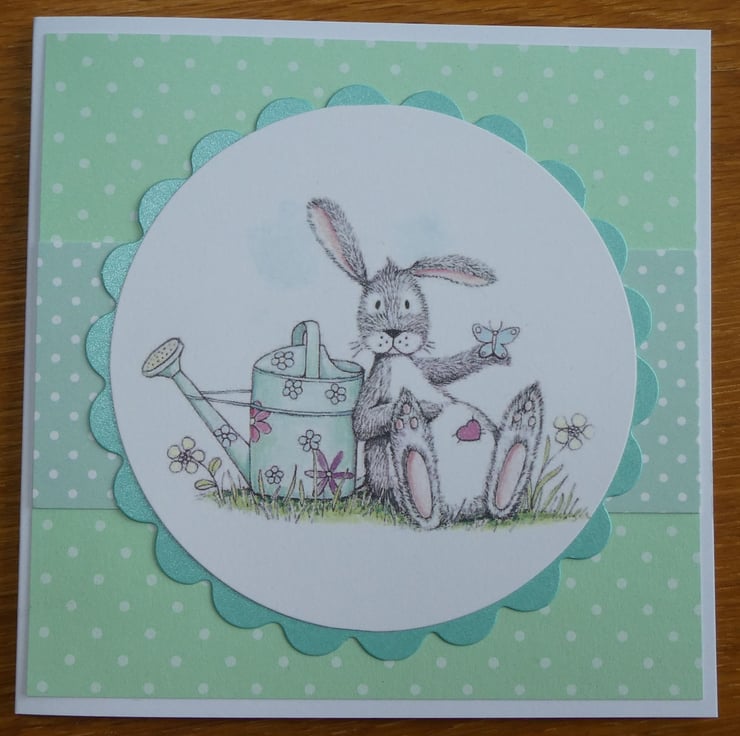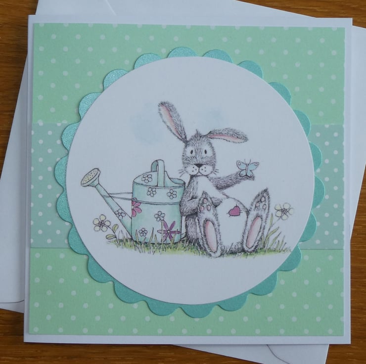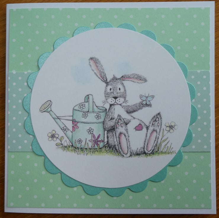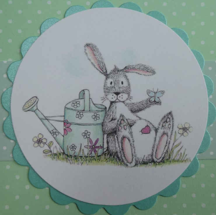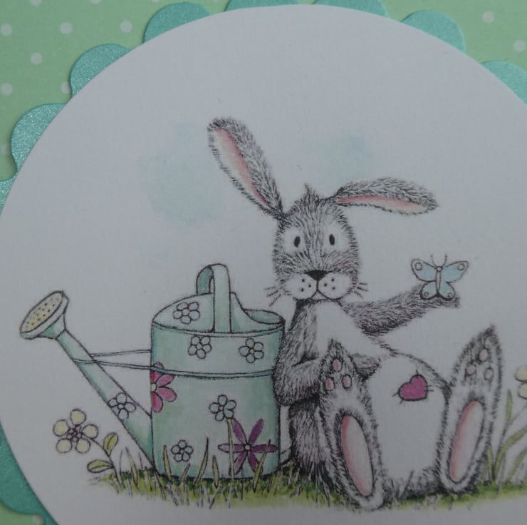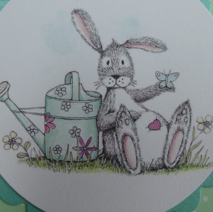 This cute card in shades of soft green, grey and white has a printed topper showing a grey and white rabbit, with a pink heart on it's tummy, leaning against a watering can while a butterfly rests on it's hand.