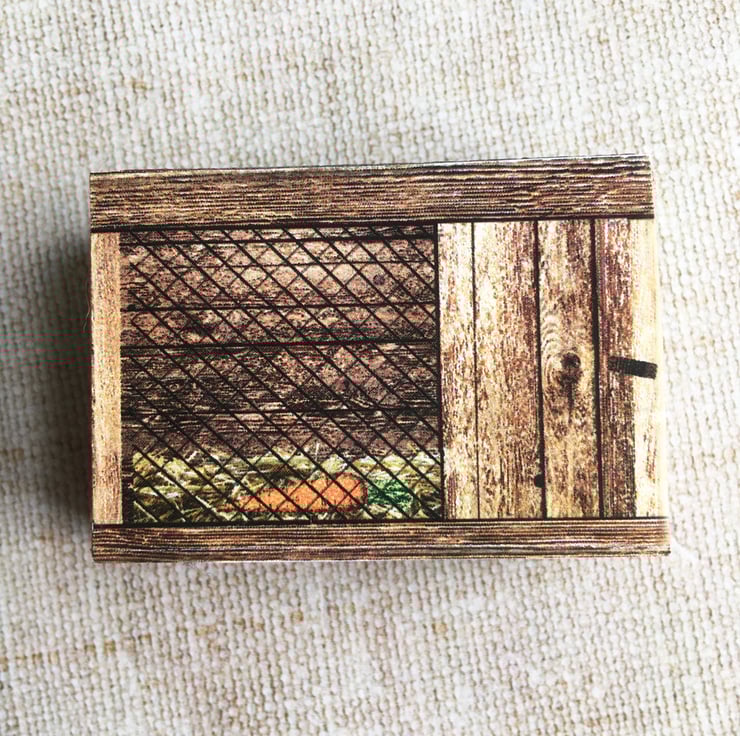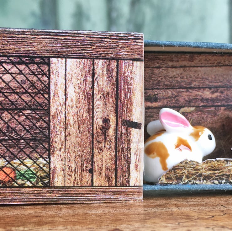 This diorama is housed inside a vintage matchbox. I've covered the top label and made the scene inside using colour paper copies backed with card. Apparently rabbits don't like to live on their own so I've added two tiny resin ones which I've painted with a very small brush!