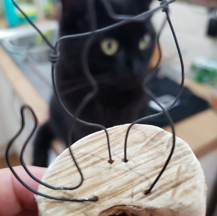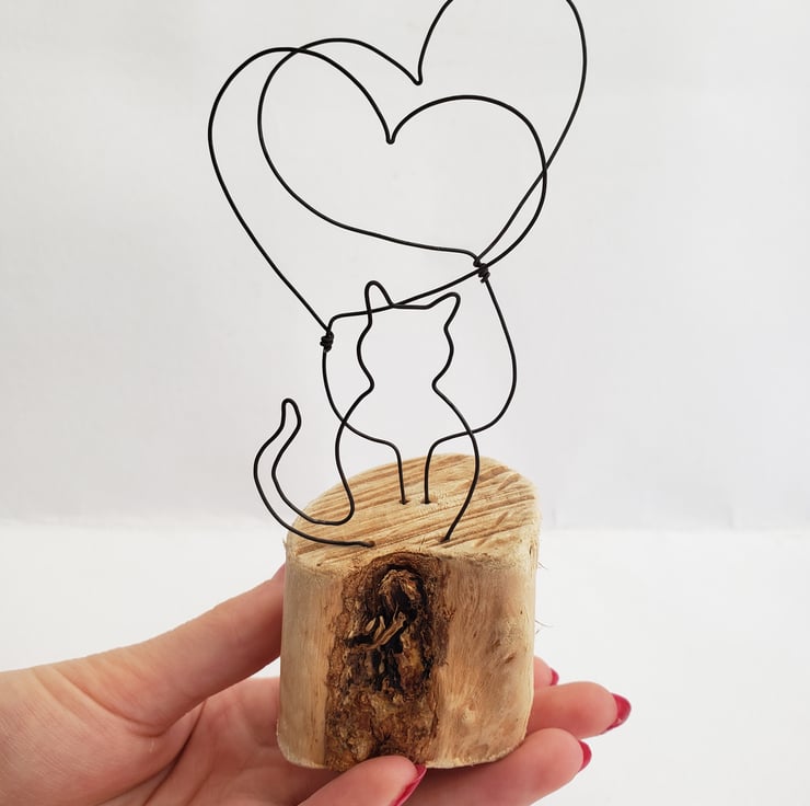 This wire work art depicts two hearts looking lovingly over their cat. Perfect gift for those cat crazy, fur baby parents. Set on driftwood collected from the Jurassic coast.
