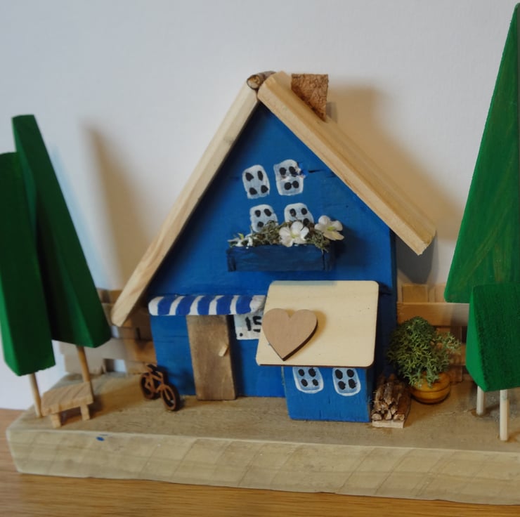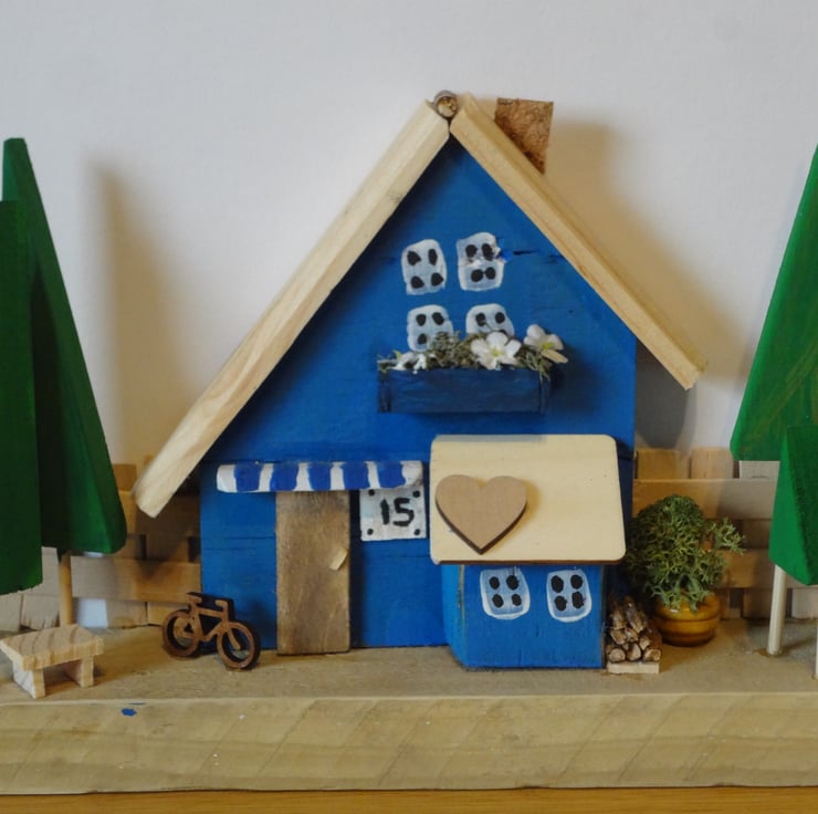 Blue wooden house fenced with trees 8" wide x 6" high. I made these in my workshop and have a wide variety of villages and single houses.