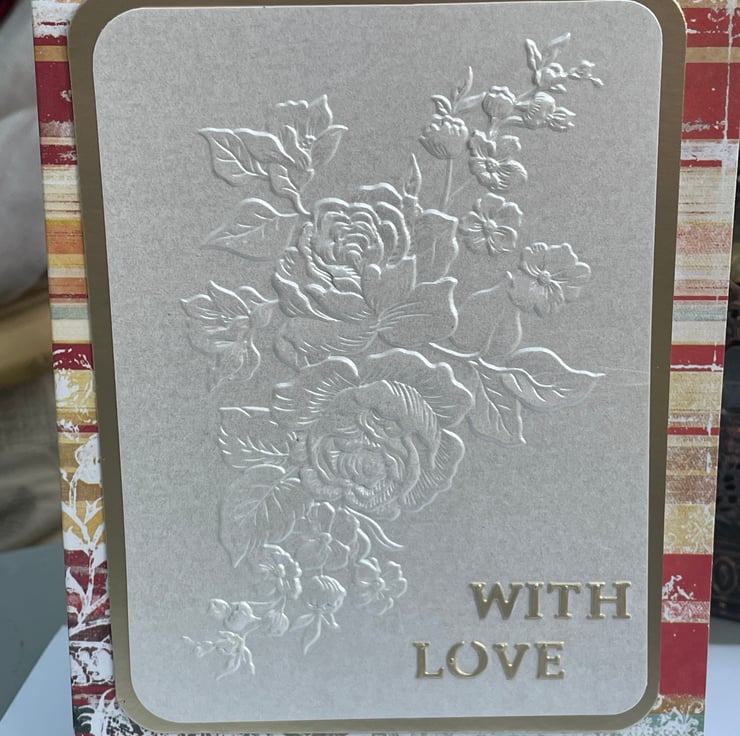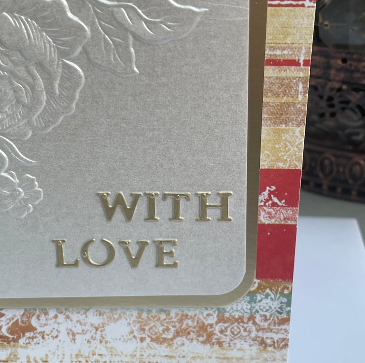 An unusual and unique card to send love to a special person. This 17.5x13cm (approx) card has a colourful striped background with autumnal reds, oranges and yellows. This is topped with a brushed gold mat and the main design is on this. The main design is a rose spray embossed into gold/cream pearlised card. This is finished with the greeting With love. This allows the card to be used for many occations.