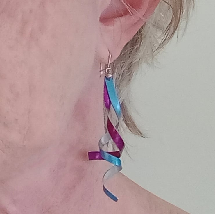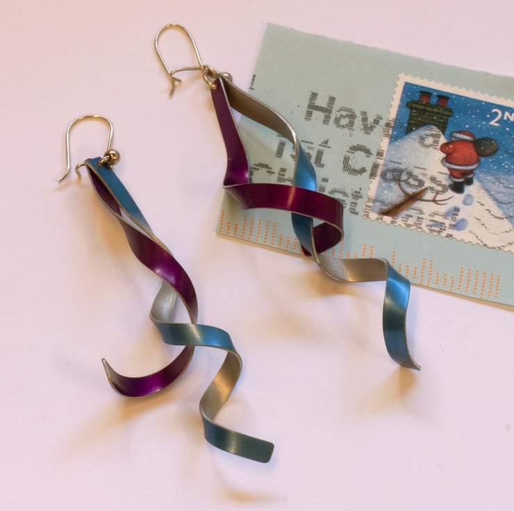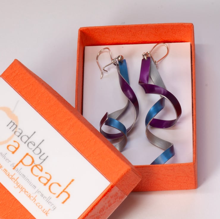These eye catching lightweight anodised aluminium earrings are dyed on one side and then twisted to reveal the natural aluminium colour that is like a satin silver.