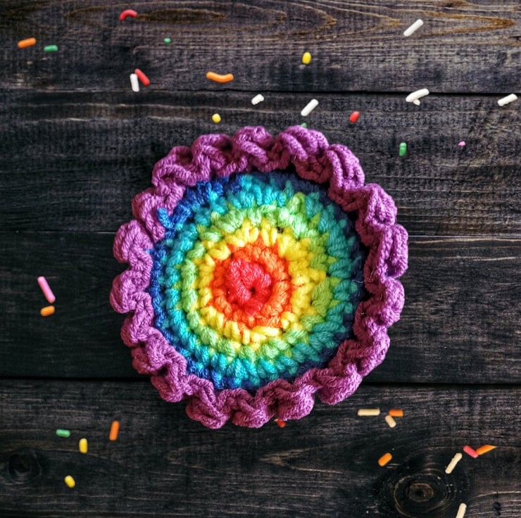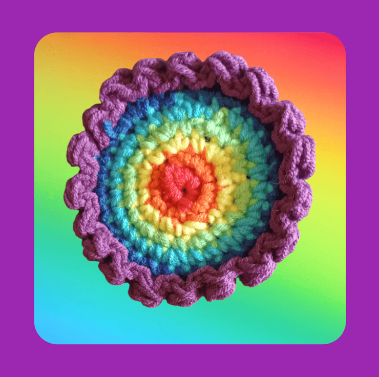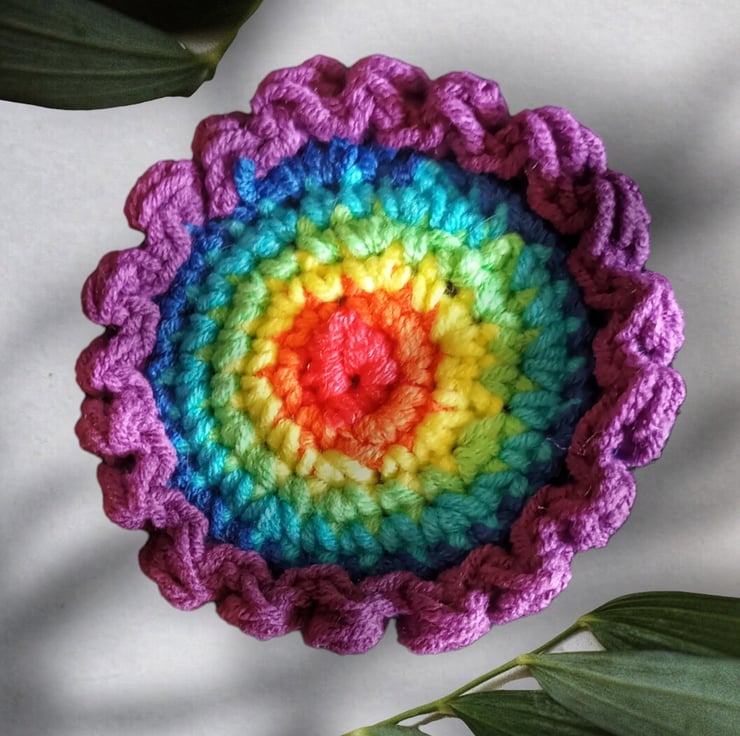 Crocheted rainbow flower brooch with vegan felt backing. 7 cm diameter