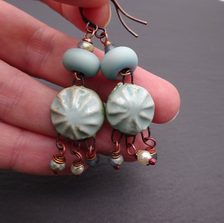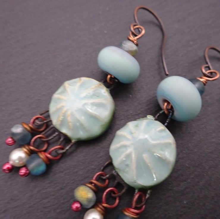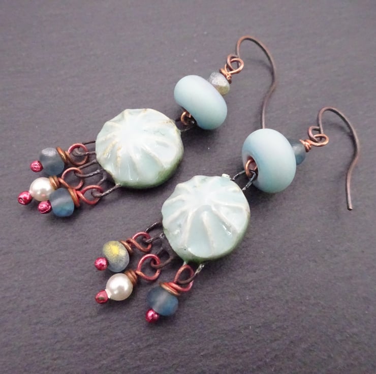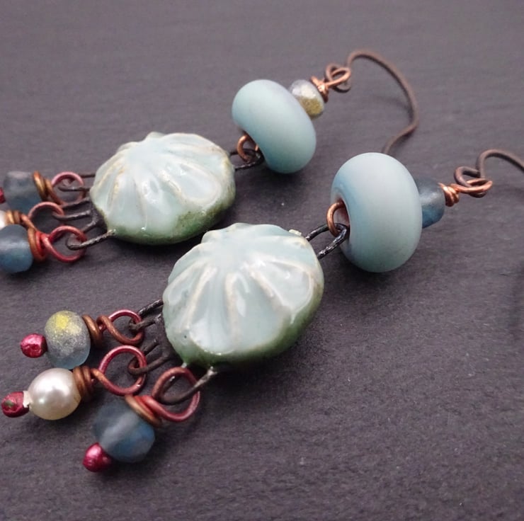 A pair of earrings made with handmade copper ear wires, handmade lampwork glass beads, handmade ceramic limpit shell connectors with a blue glaze, small glass pearls and blue glass beads.