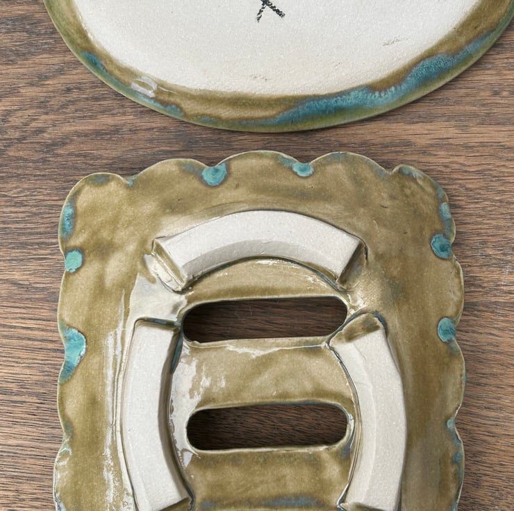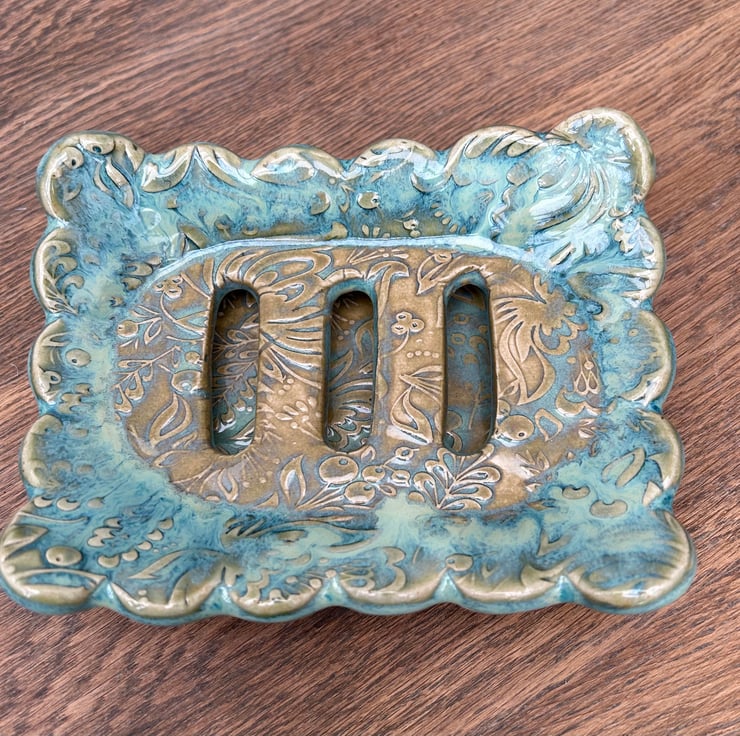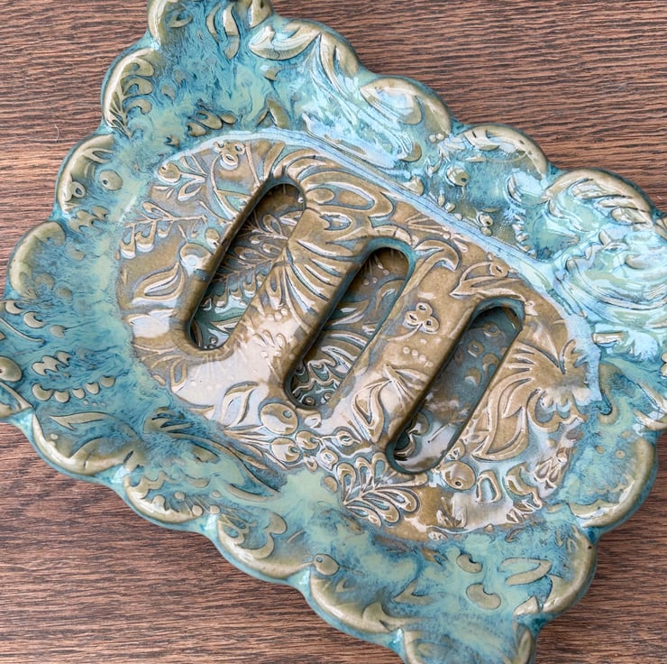 Handmade ceramic soap dish & tray in greens